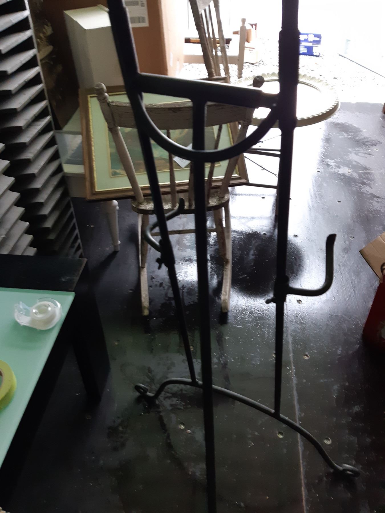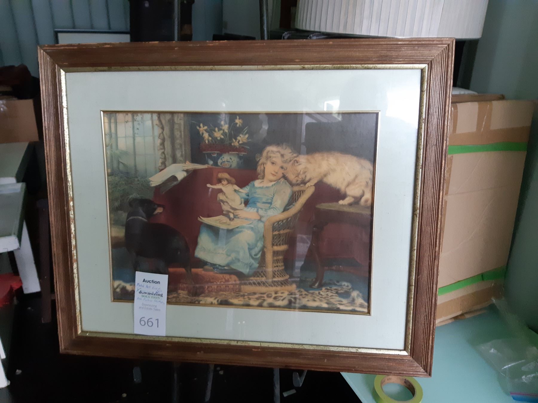 Metal Art Easel 65", framed art and box of picture frames. Pickup at 9 am