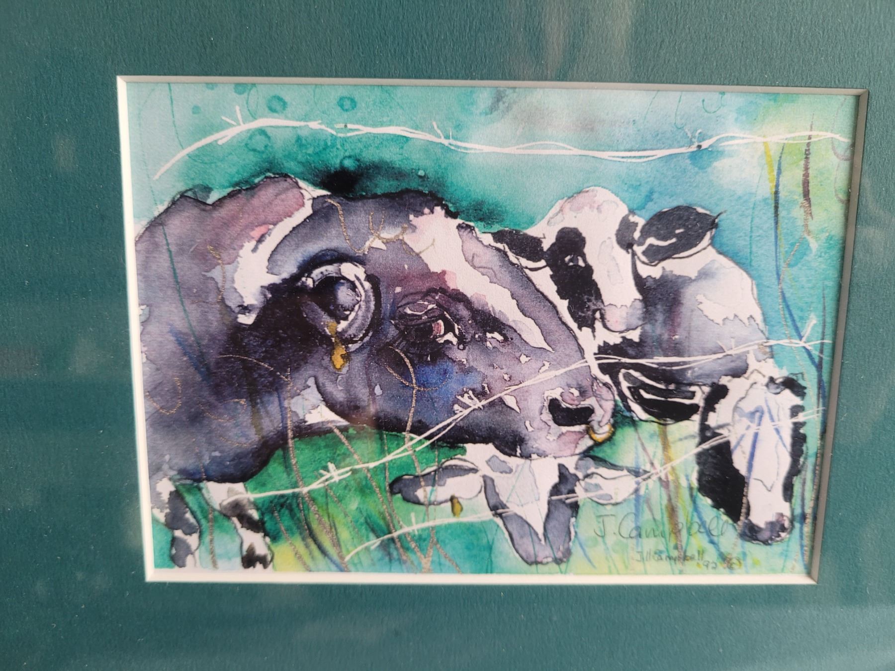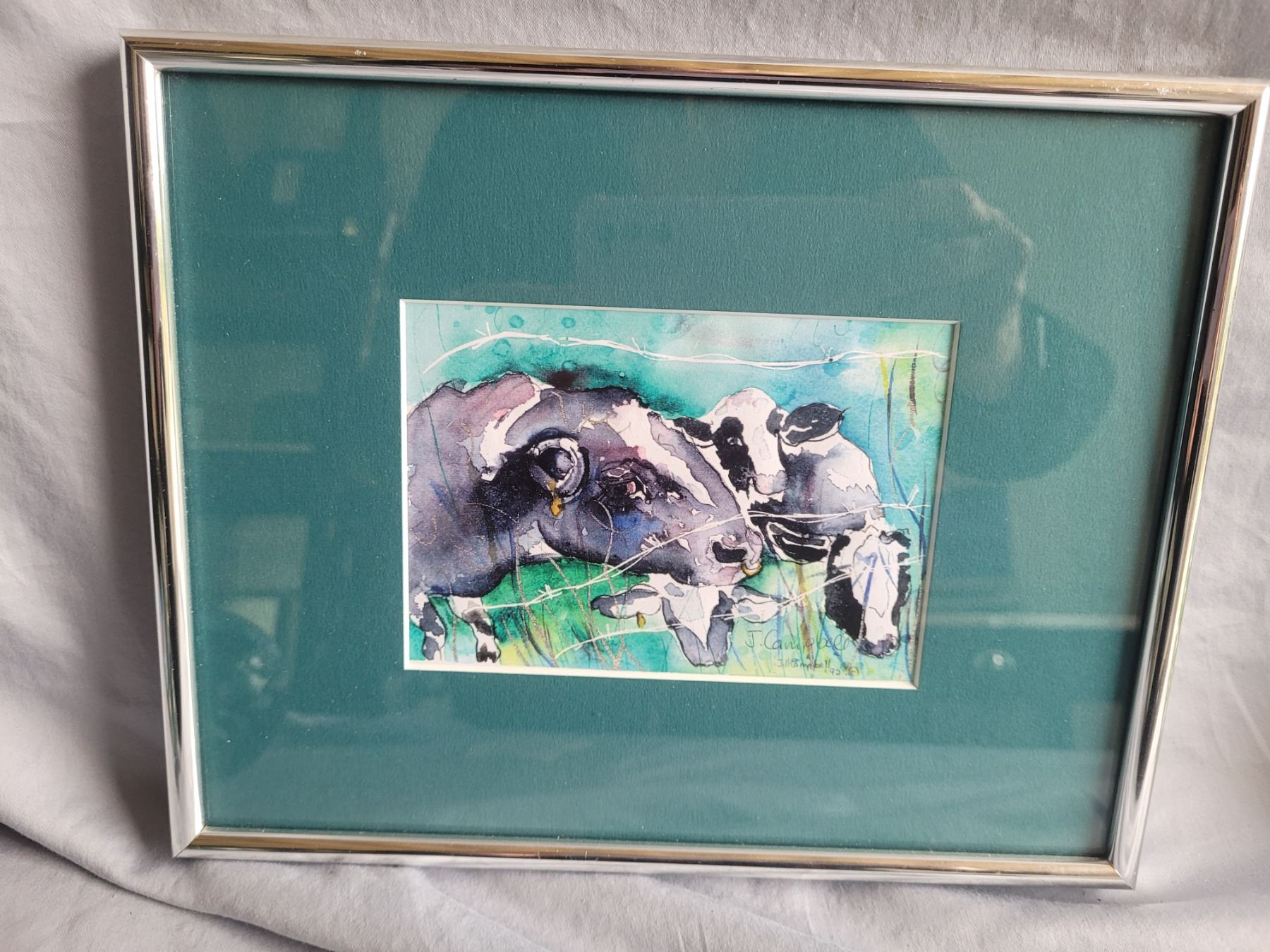 Framed and signed art 10x8 " Blue/Green Swirl paperweight made by Adam Jablonski glass blower in Poland. Glass paperweight with fish. Pickup at 9 am