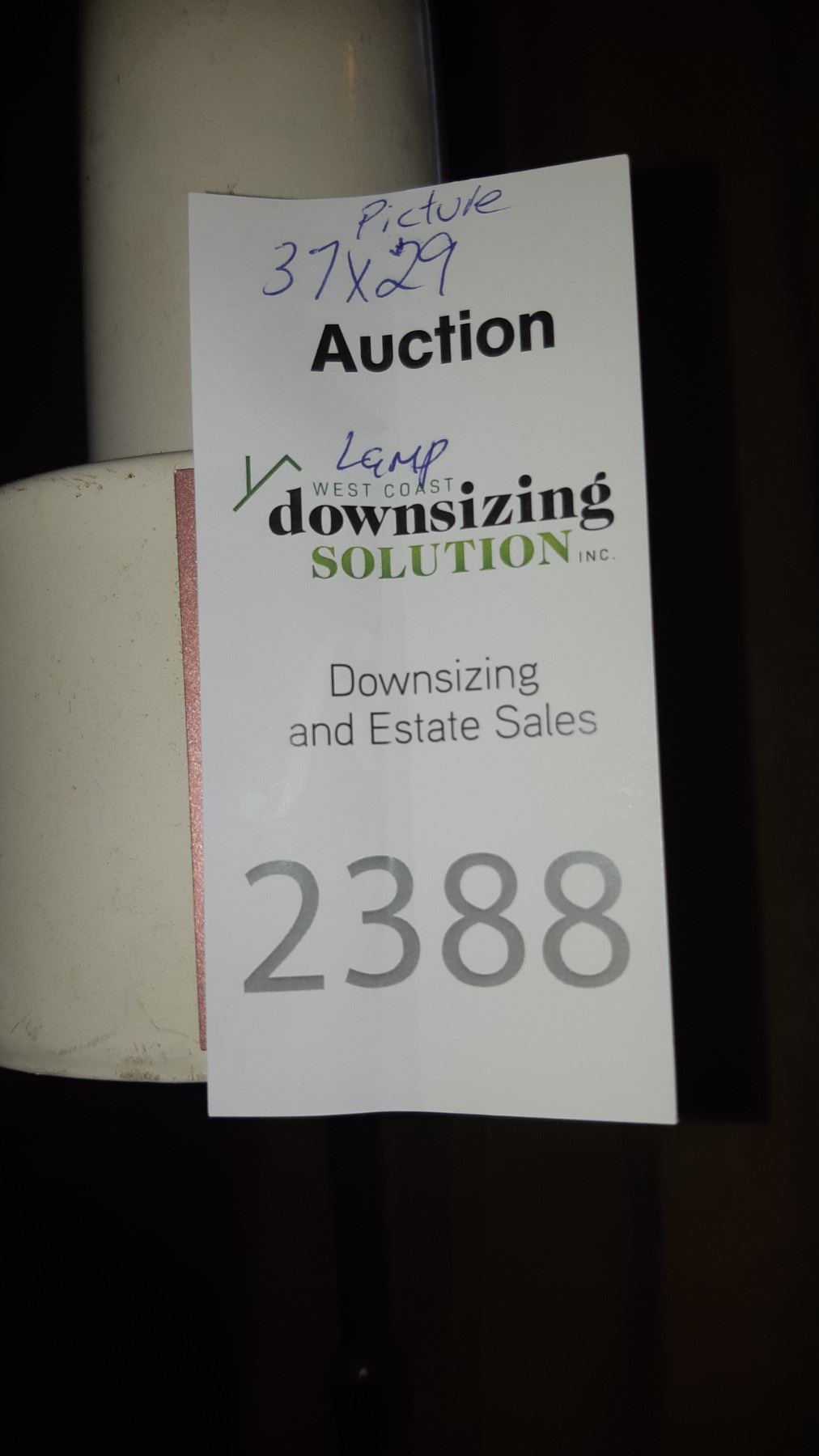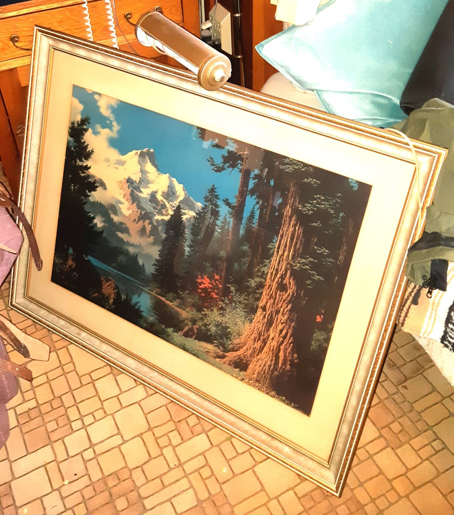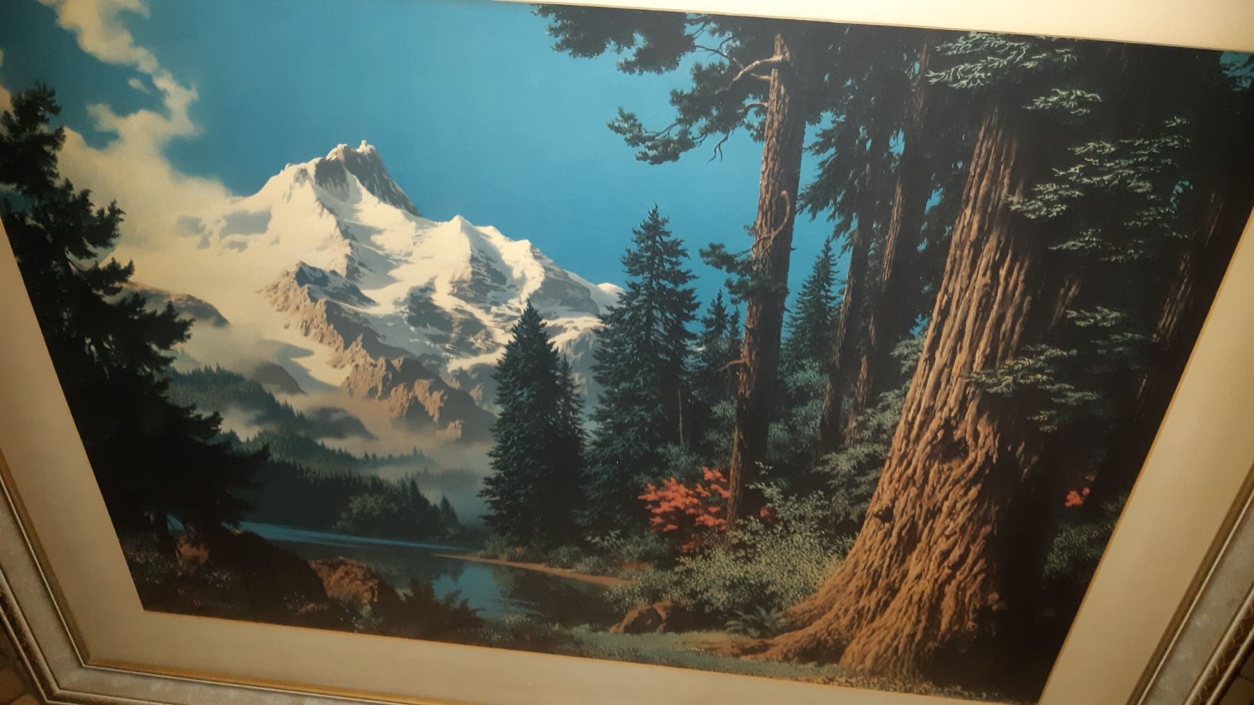 Framed art of mountain scene, picture lamp, floor lamp. Pick up 9-10