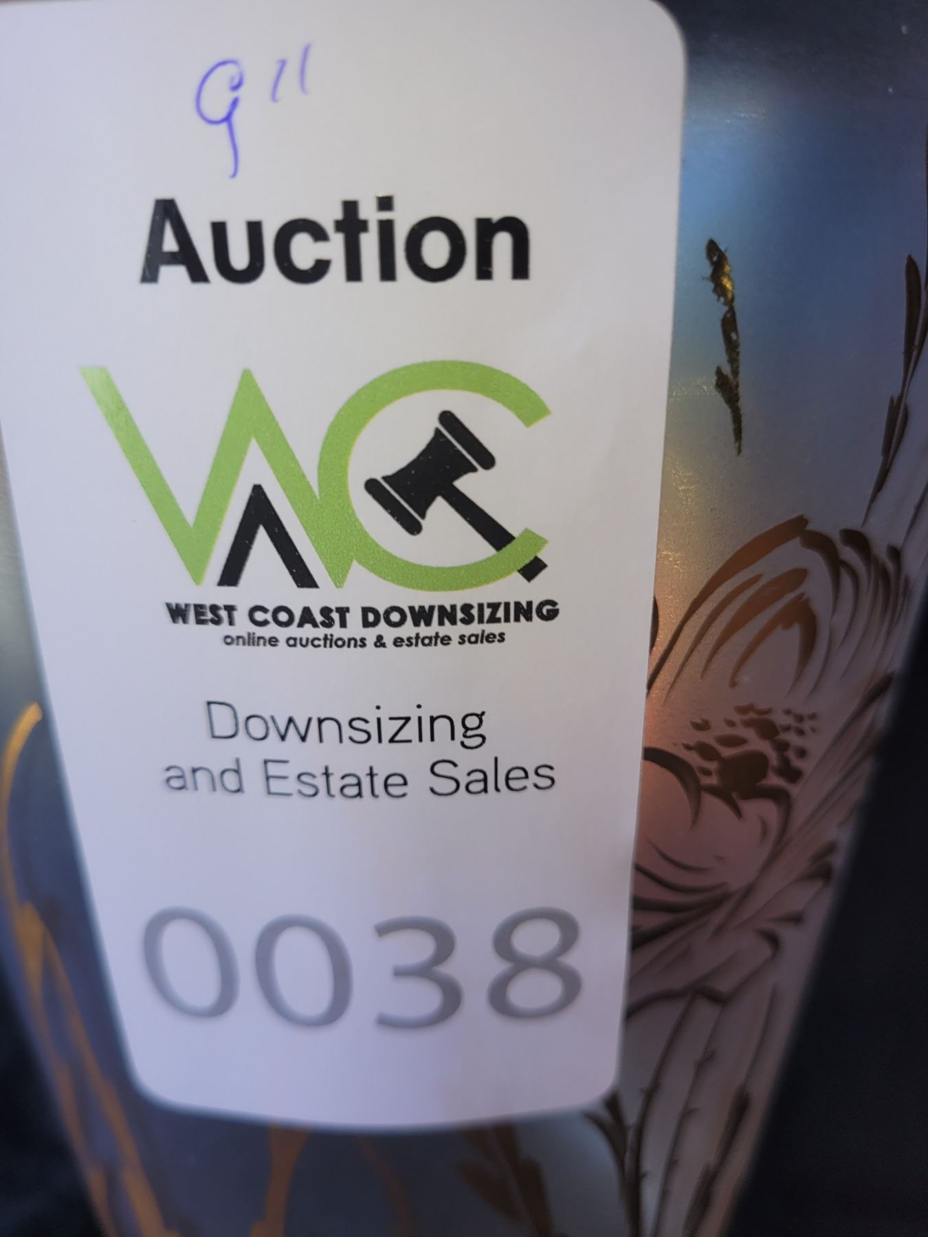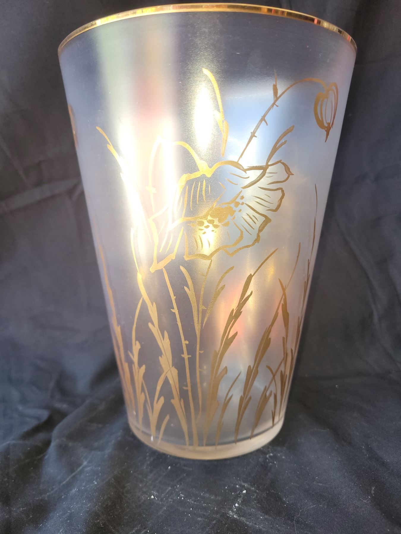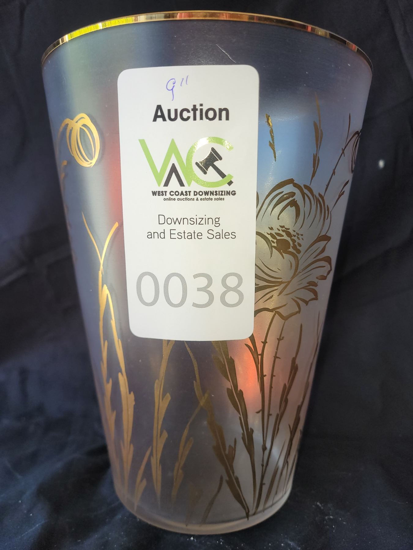 9" opaque gold flower motiff vase. Pickup at 9 am