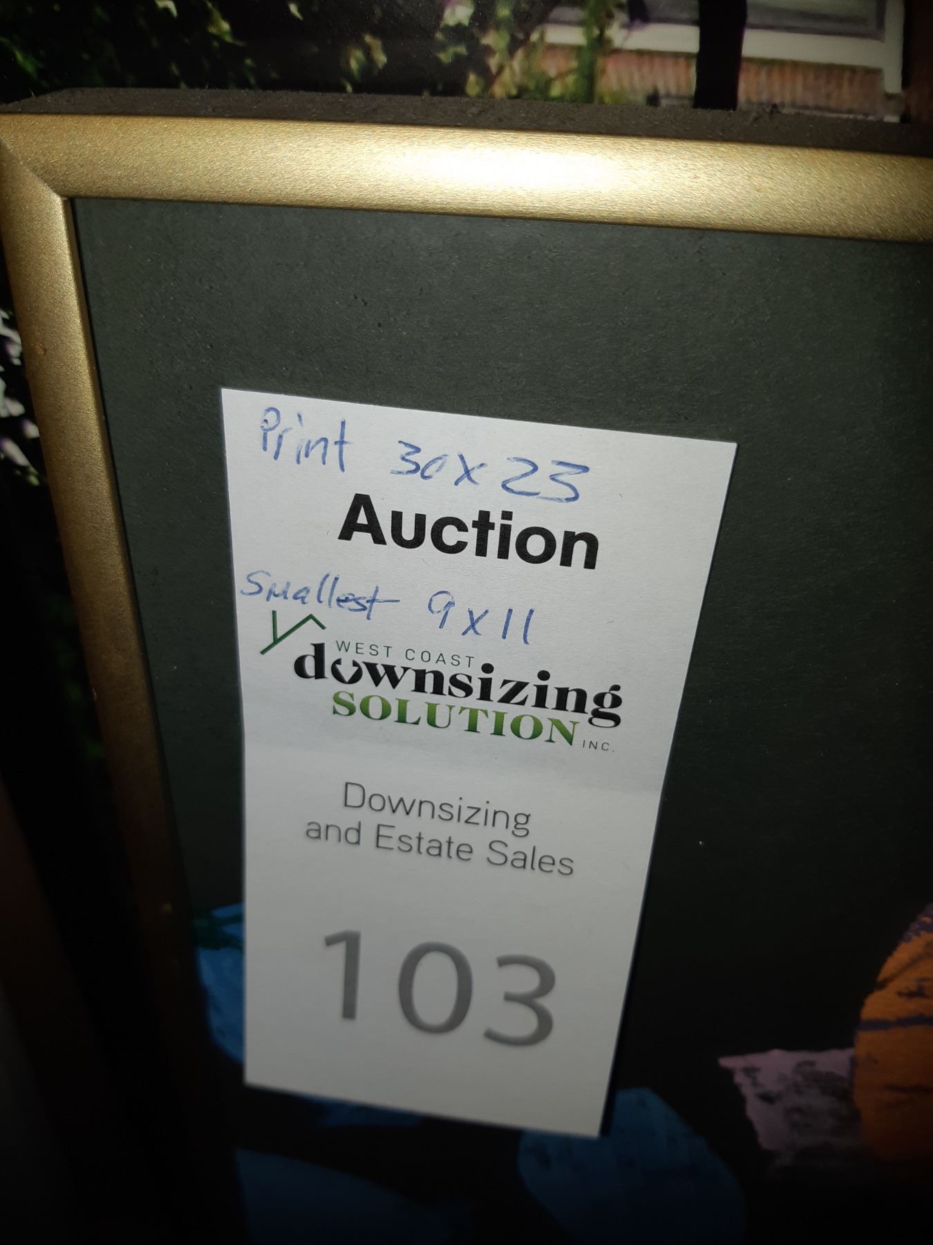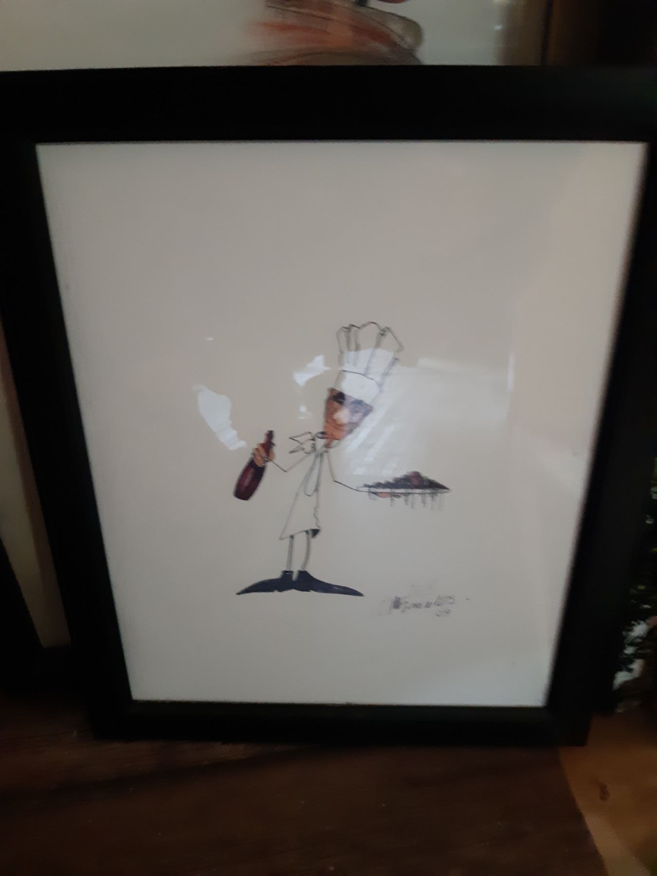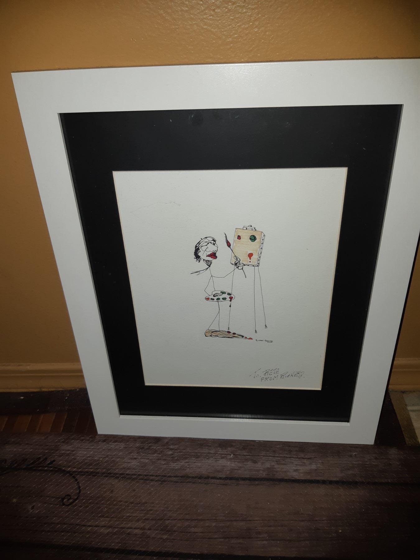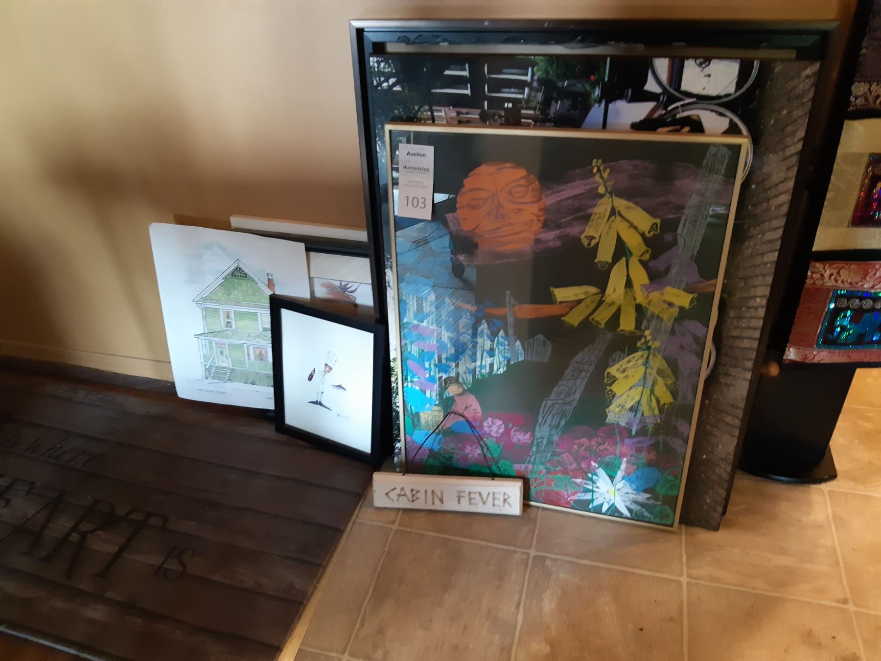 Pen and ink drawings, Cabin Fever sign, and 2 prints. The larger print 30x25 needs to be glued back into the frame. Pickup at 9 am.