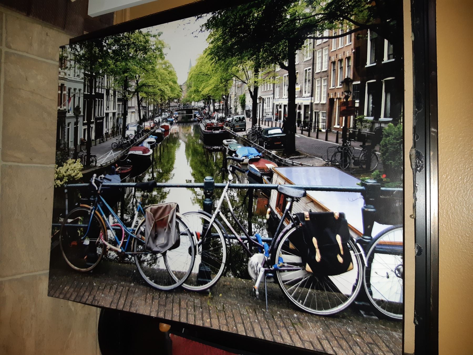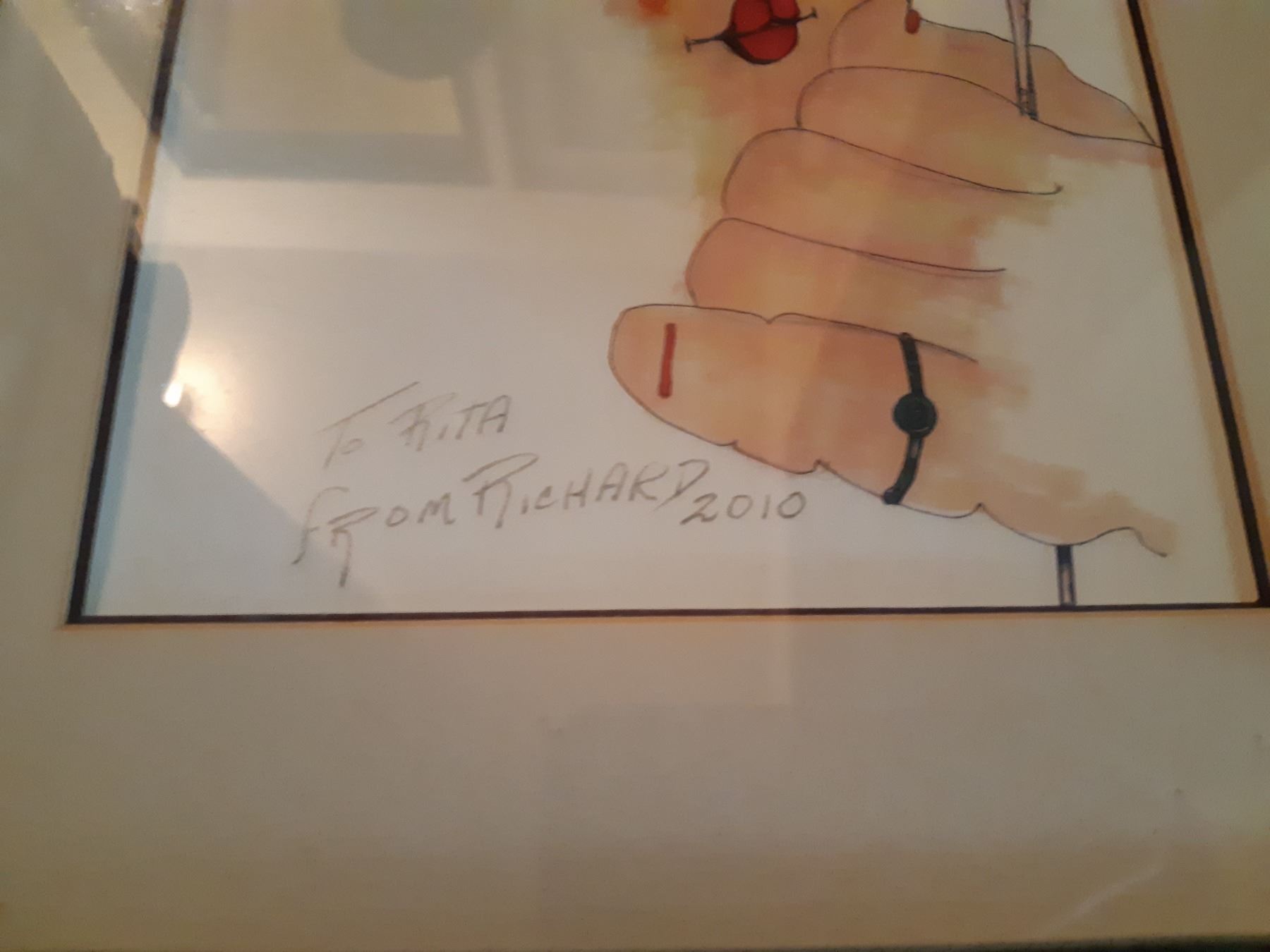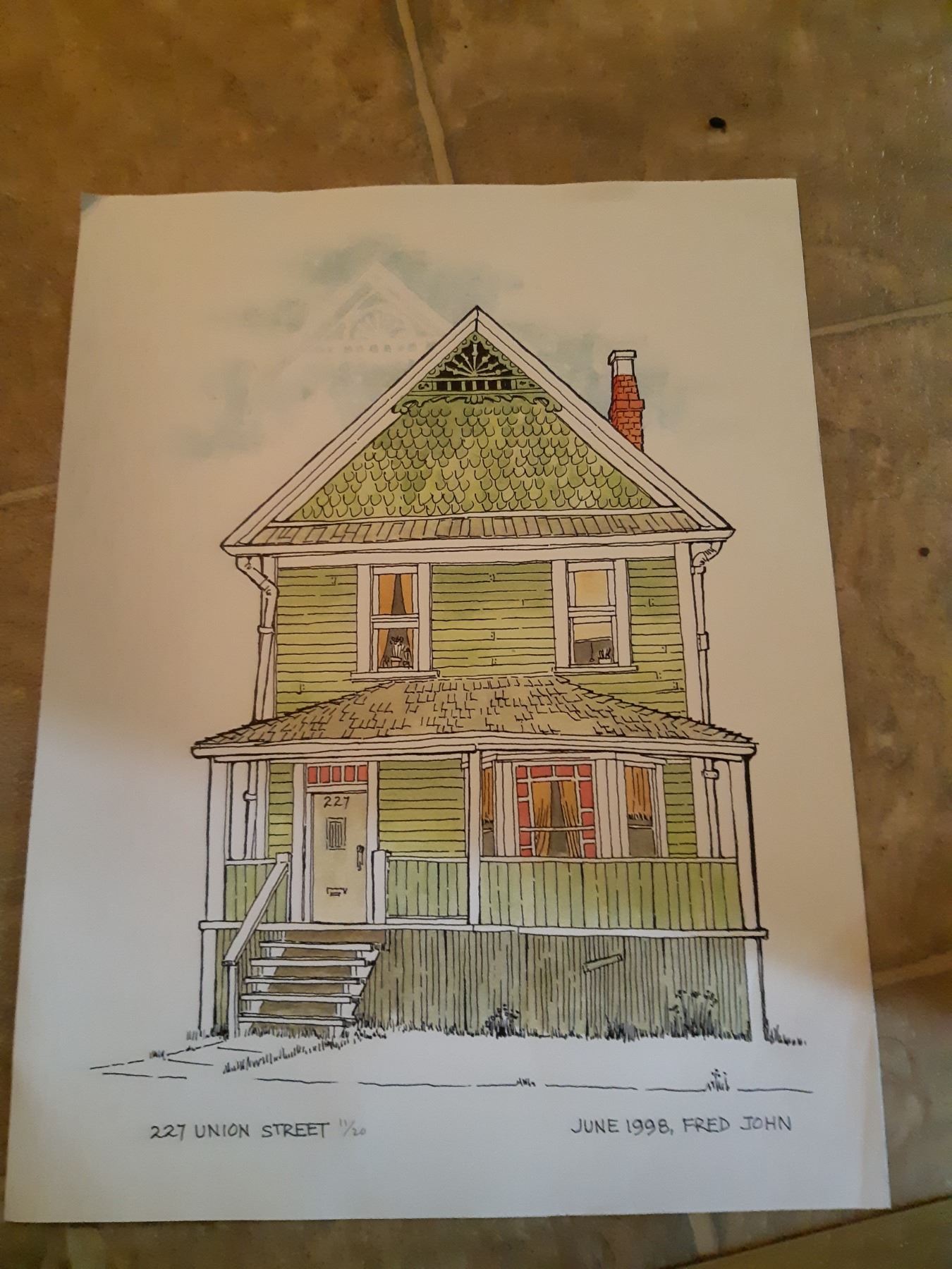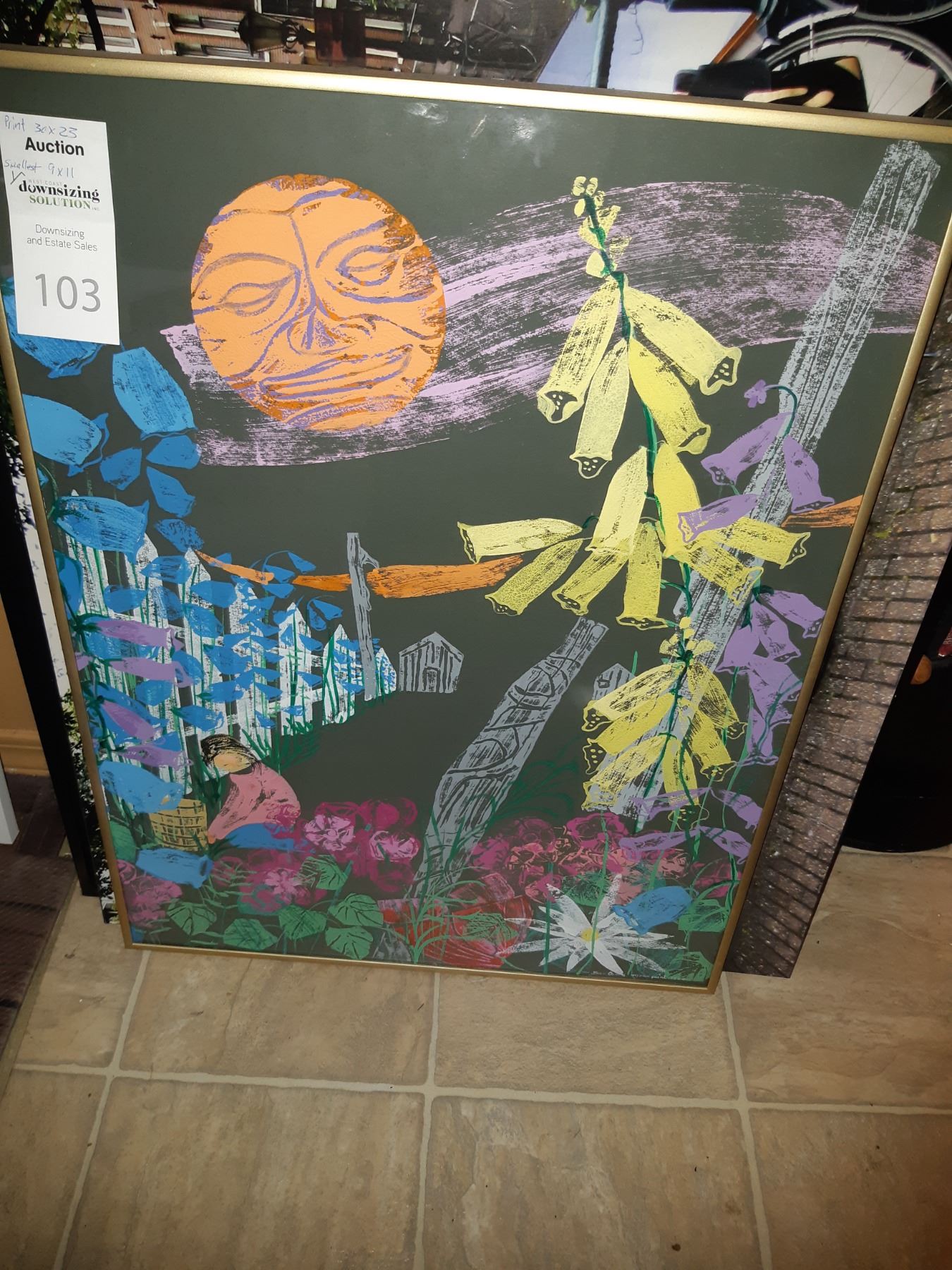 Pen and ink drawings, Cabin Fever sign, and 2 prints. The larger print 30x25 needs to be glued back into the frame. Pickup at 9 am.
