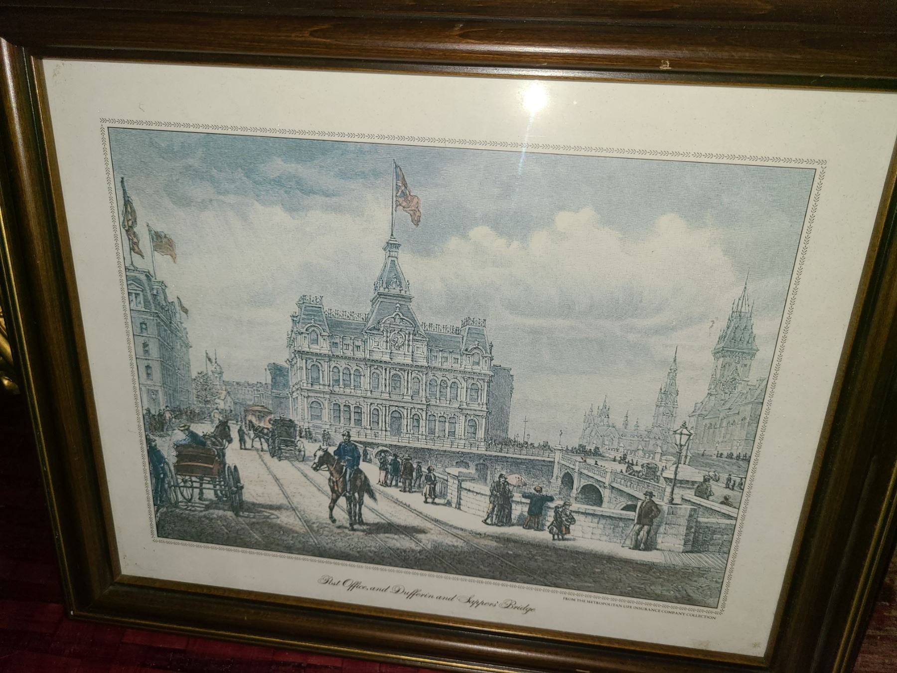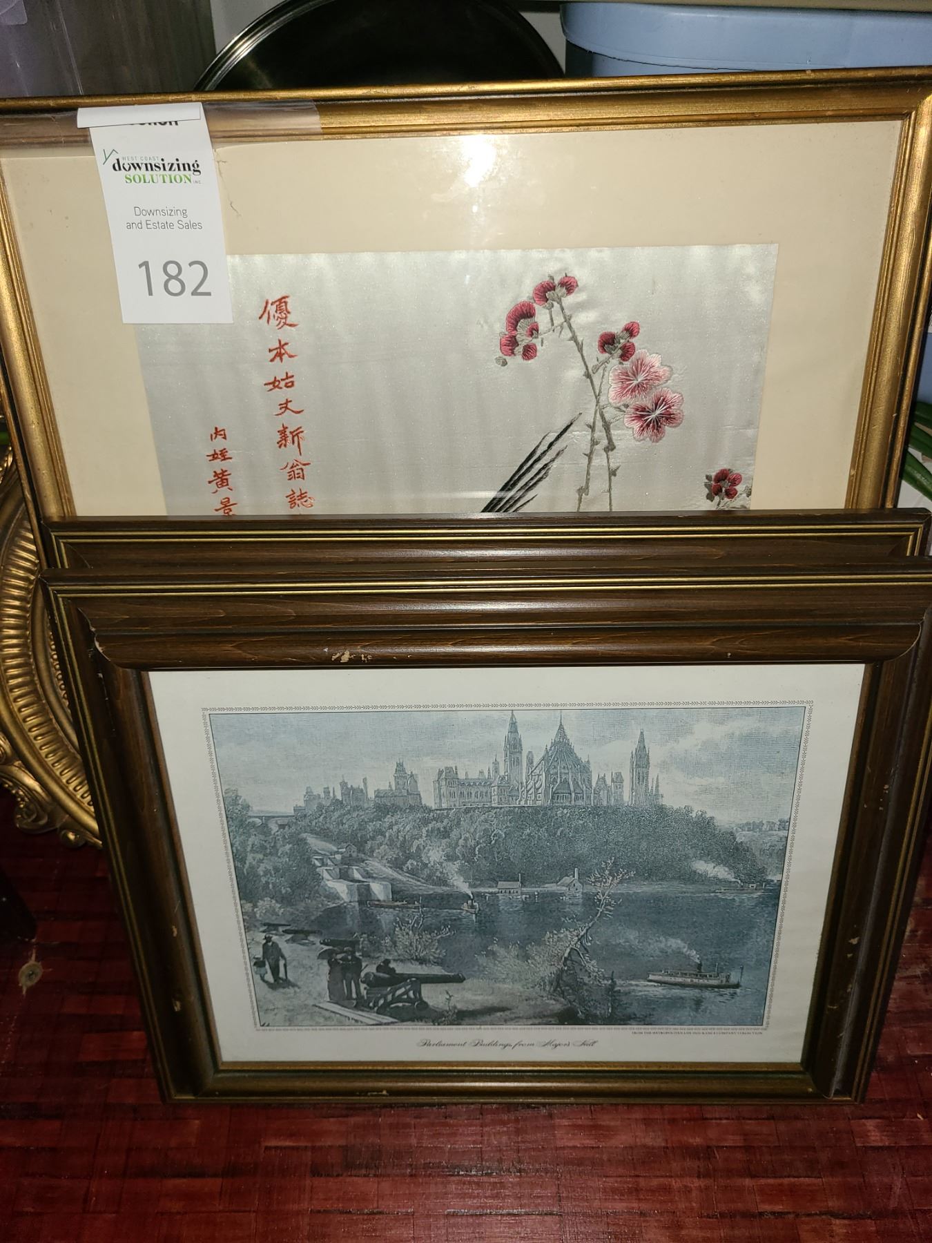 Framed Asian art of birds done in silk, 2 framed prints and ornate gold plaster cast mirror . Pickup at 10am