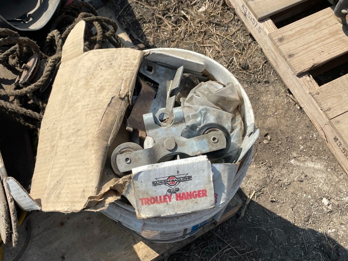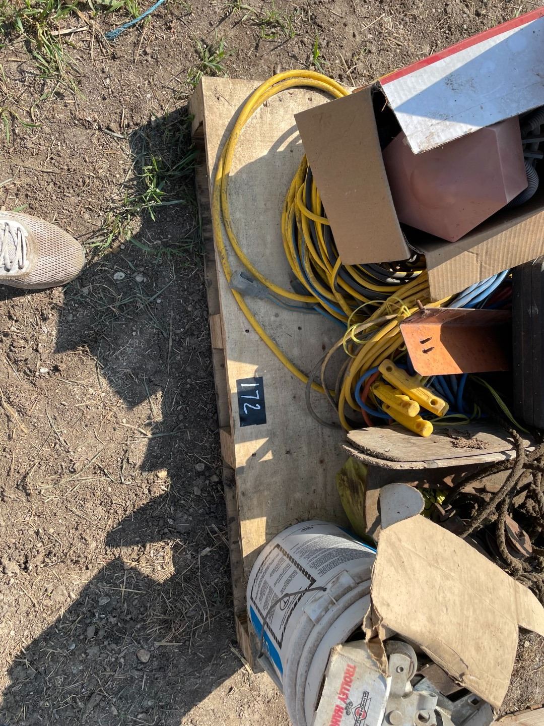 Assort elec cords, barn door rollers, New 12V elec winch, 120V Arc welder,