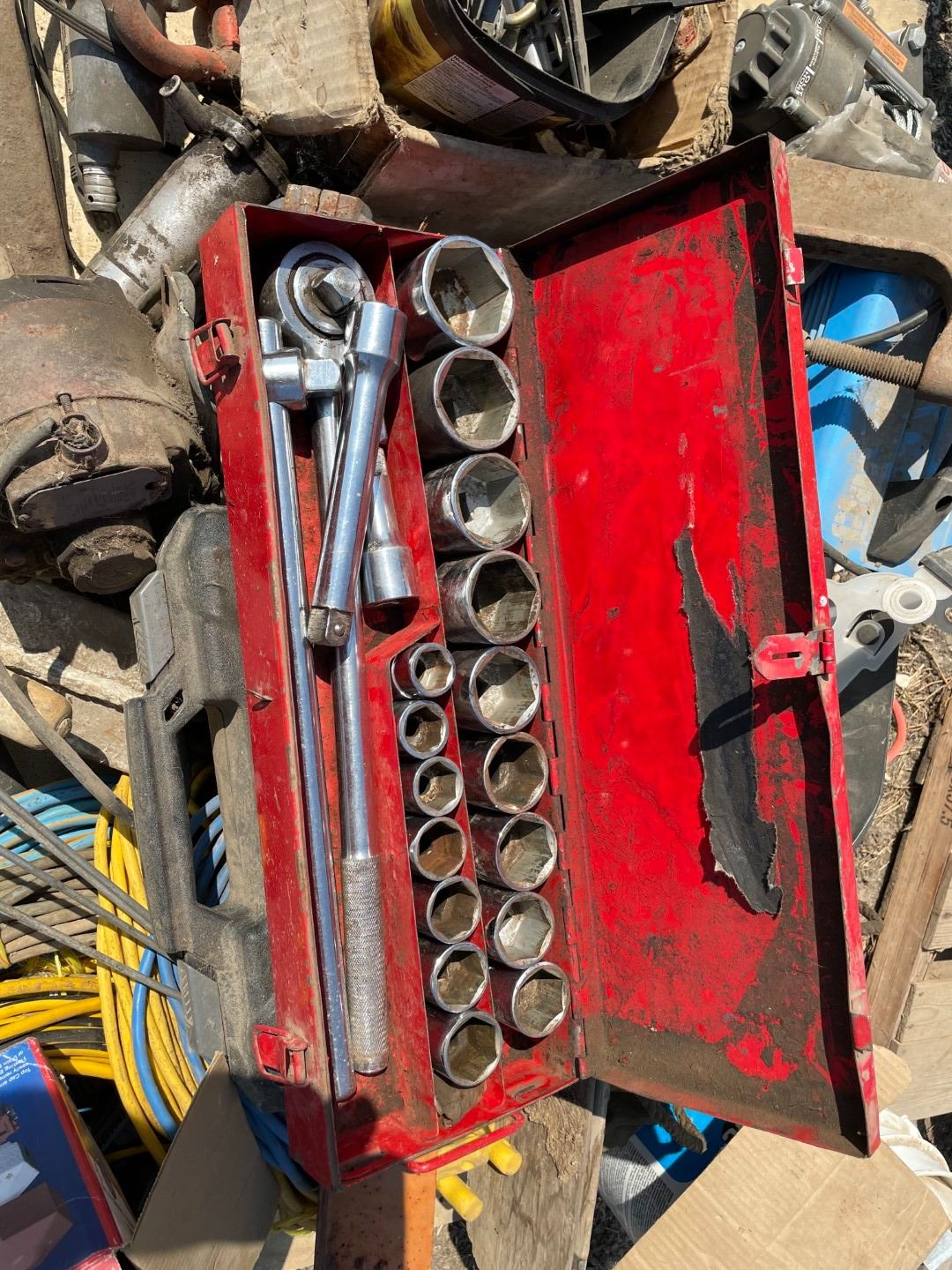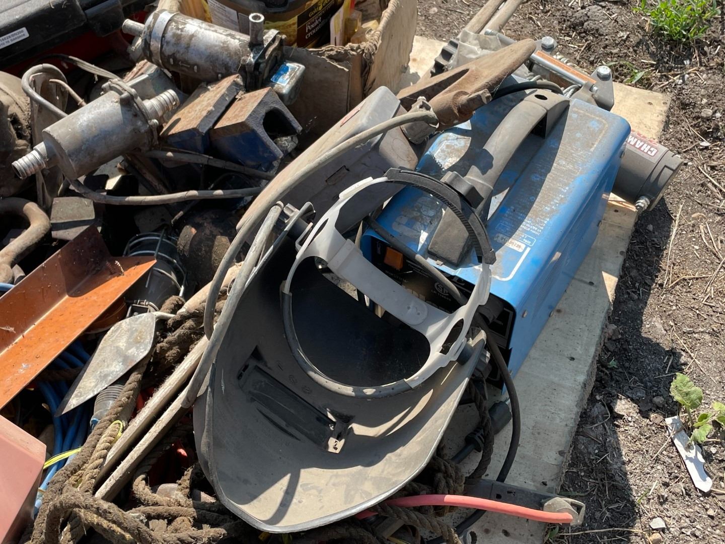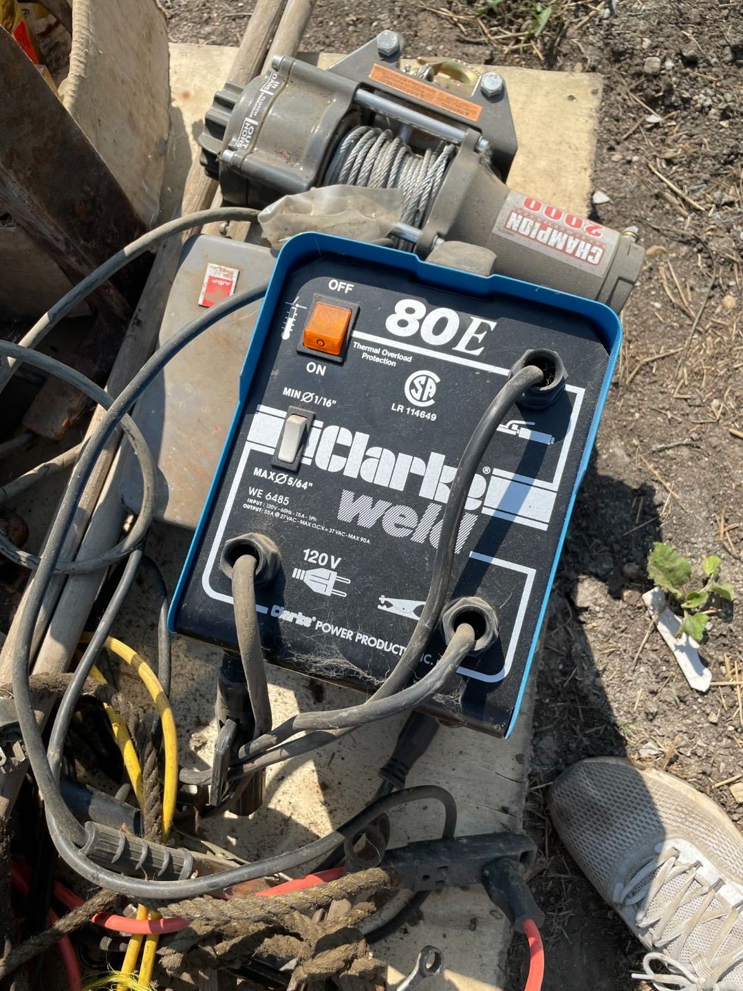 Clarke Weld 120V ark welder, 3/4 drive socket set, New 12V elec atv winch, barn track rollers