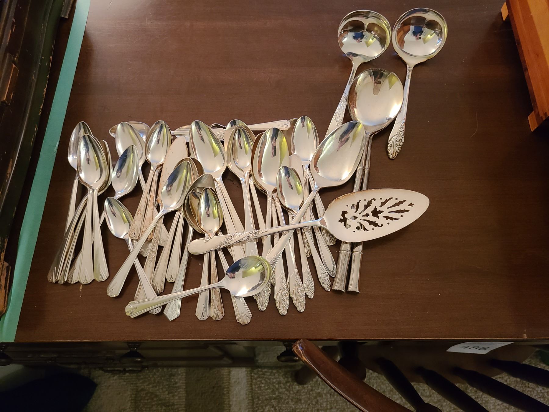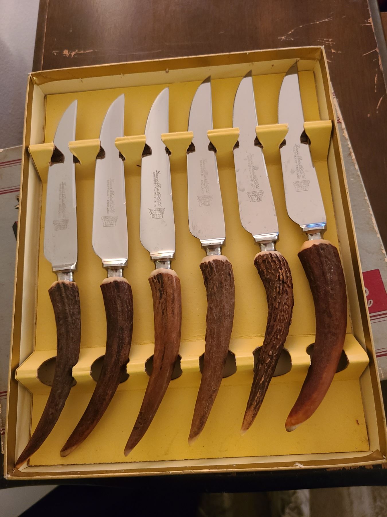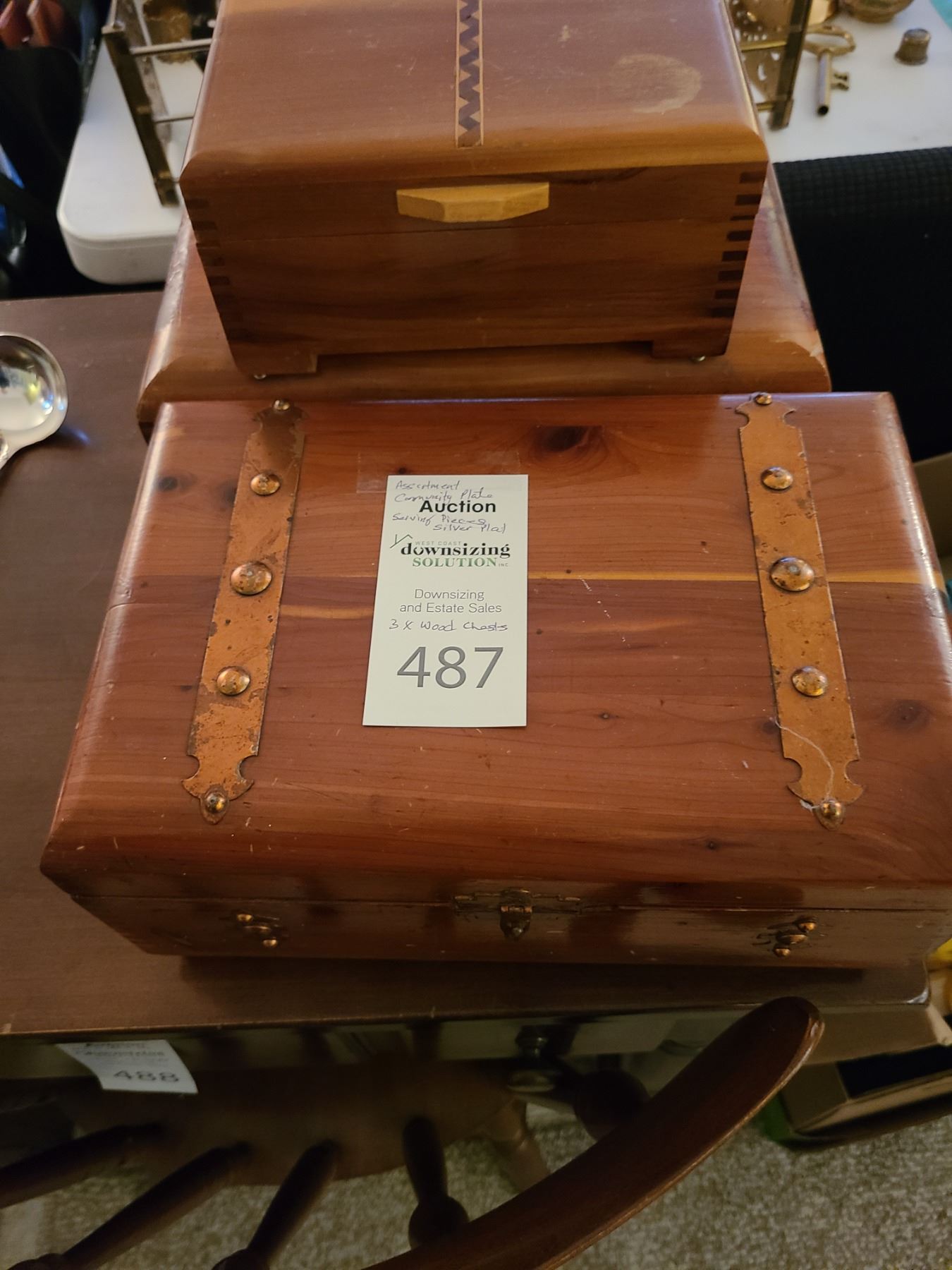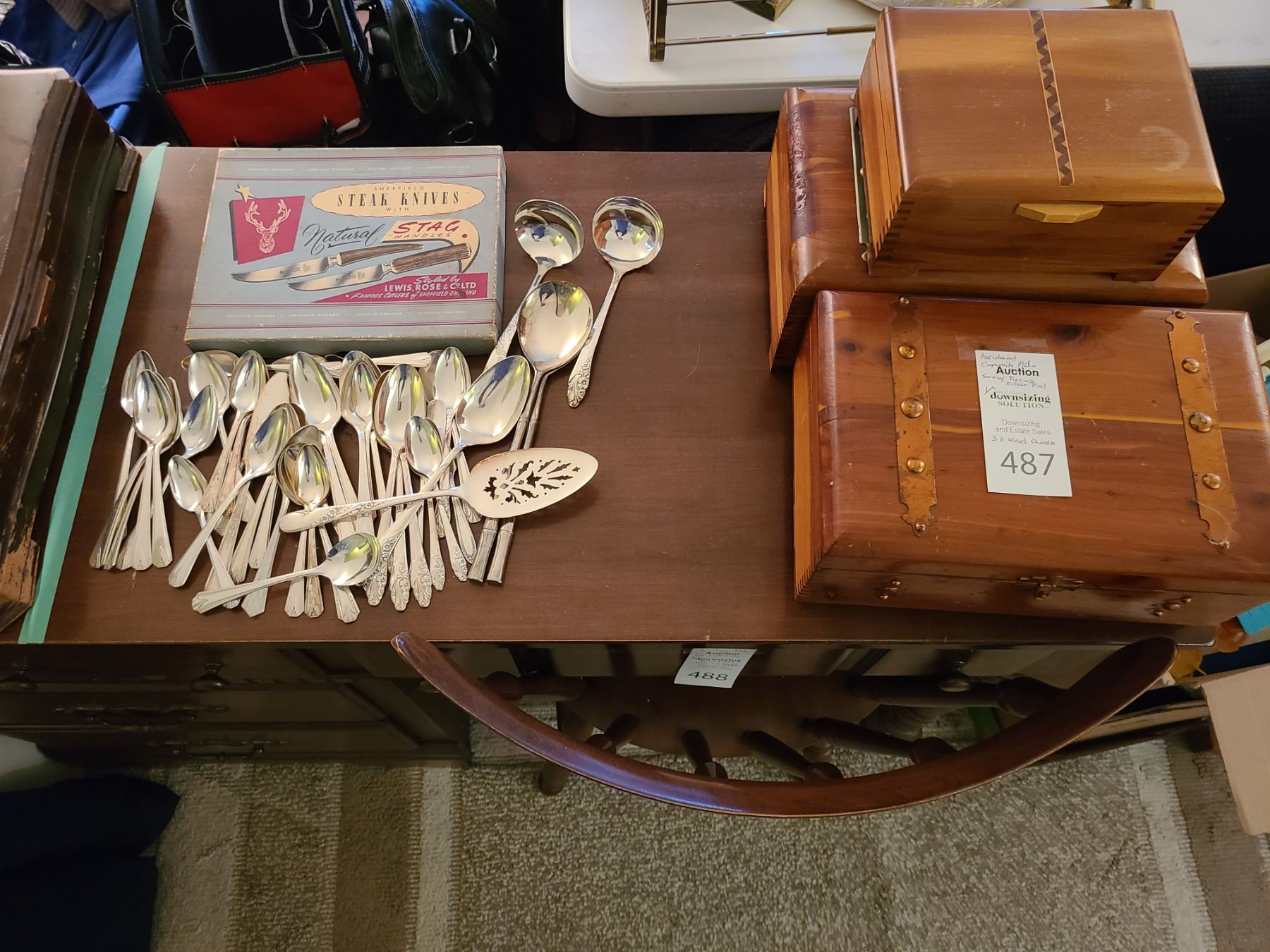 Assorted pieces, 3 patterns, 3 wooden chests and box of Stag handle steak knives. Boxed up. Pickup in cat. A. at 9 am.