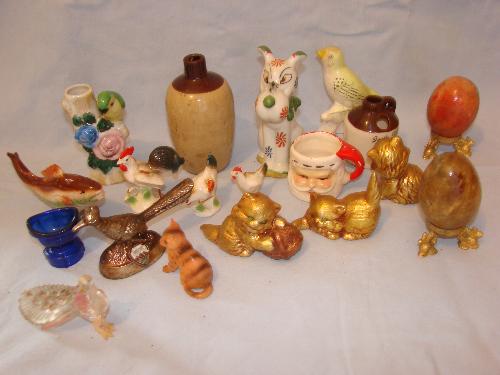 Assorted Knick-Knacks-marble eggs, roosters, dogs.