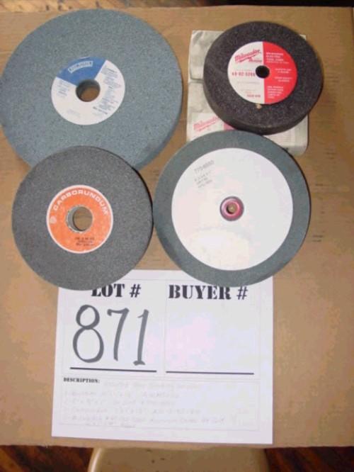 1 - Baystate 10" by 1" x 1 1/4" - A46M5V22. 1 - 8" X 3/4" X 1" - 60 Grit # 770-6550. 1- Carborundum - 7" x 1" x 1 1/4" - A36 - 3 - N5 - V10. 1 Milwankee #49-92-3260 Aluminum Oxide 24 Grit 6"x 1" x 5/8" Arbor.