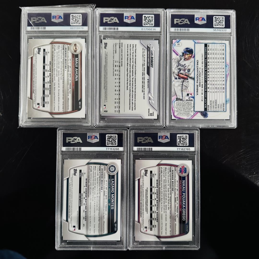 A sharp mix of PSA-graded baseball cards featuring up-and-coming prospects and early-career talent. Includes 2023 Bowman Draft Maija Ahuna Fuchsia Lunar Refractor #/199 (PSA 9), 2020 Topps Chrome Luis Robert Pink Refractor (PSA 9), and 2023 Topps Cosmic Chrome Vinnie Pasquantino Orange Galactic (PSA 8). Also featured are a 2023 Bowman Lazaro Montes Paper Prospects Fuchsia (PSA 8), and a 2023 Bowman Chrome Nikau Pouaka-Grego Atomic Refractor Auto graded PSA 10 with Auto 10. An exciting blend of rare parallels and graded rookie potential.