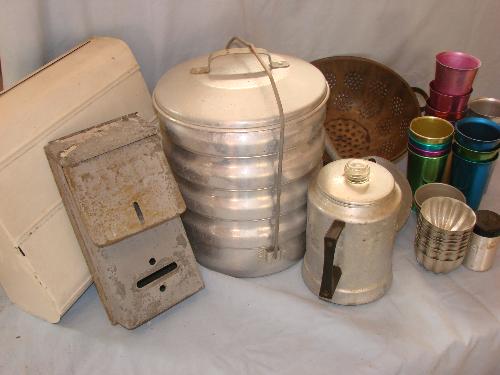 asst. aluminum kitchen items, mailbox, glasses, mold.
