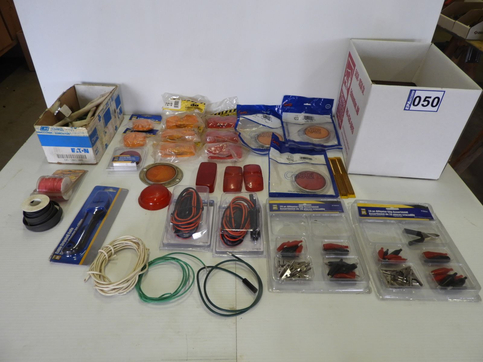 Assorted amber and red lens covers, amber and red reflectors, wire stripping knife, 12 V switches, assorted alligator clips, heat shrink tubing (most items unused)