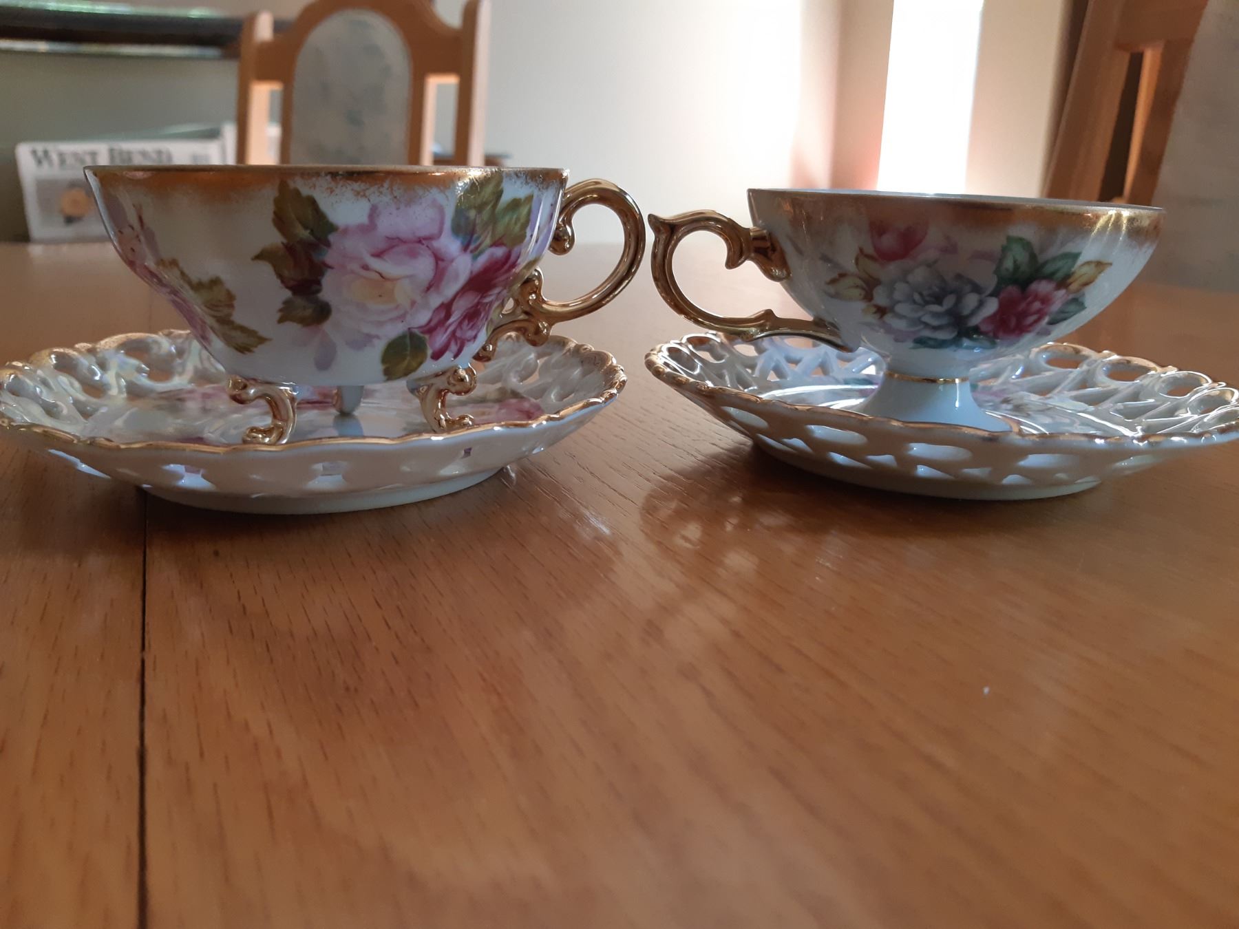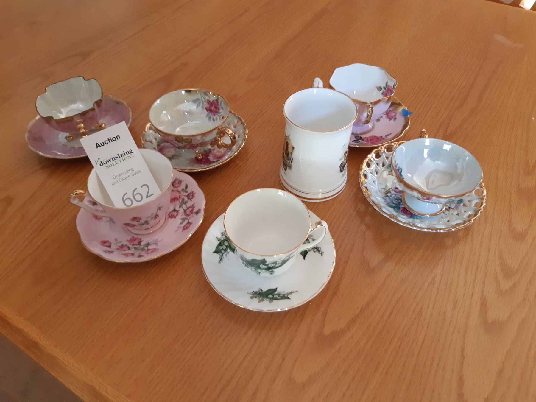 Assortment of china cup & saucers, please note the Queen Anne saucer has a chip. Royal Winton Stein Bring packing supplies and pickup at 9 am