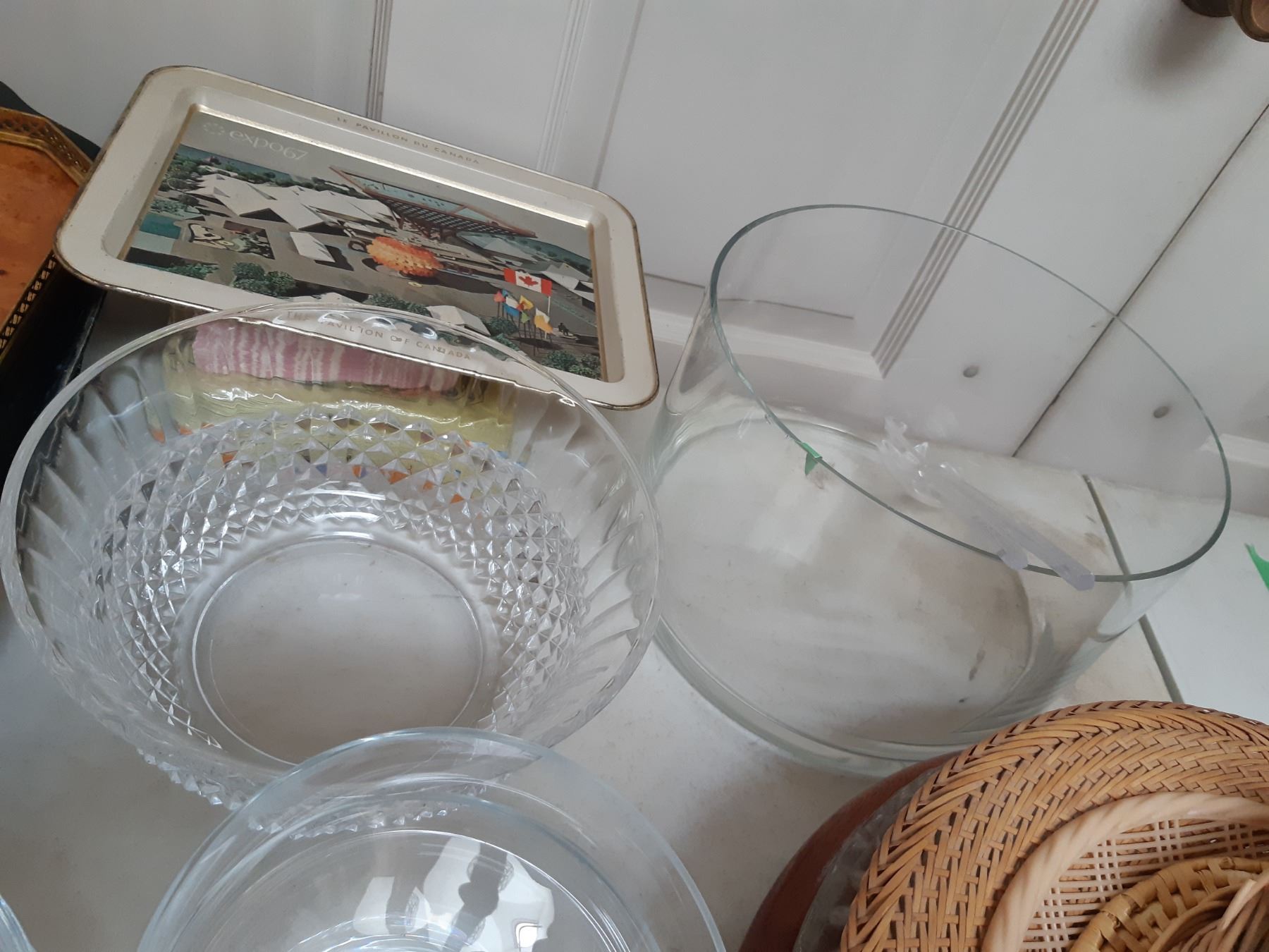 Silverplated oval tray, 6 x glass serving bowls, large wooden round serving platter 20 x 10, glass & cutglass serving platers, glass salad bowl, note chip. and other serviing pieces. Bring packing supplies and pickup at 9 am