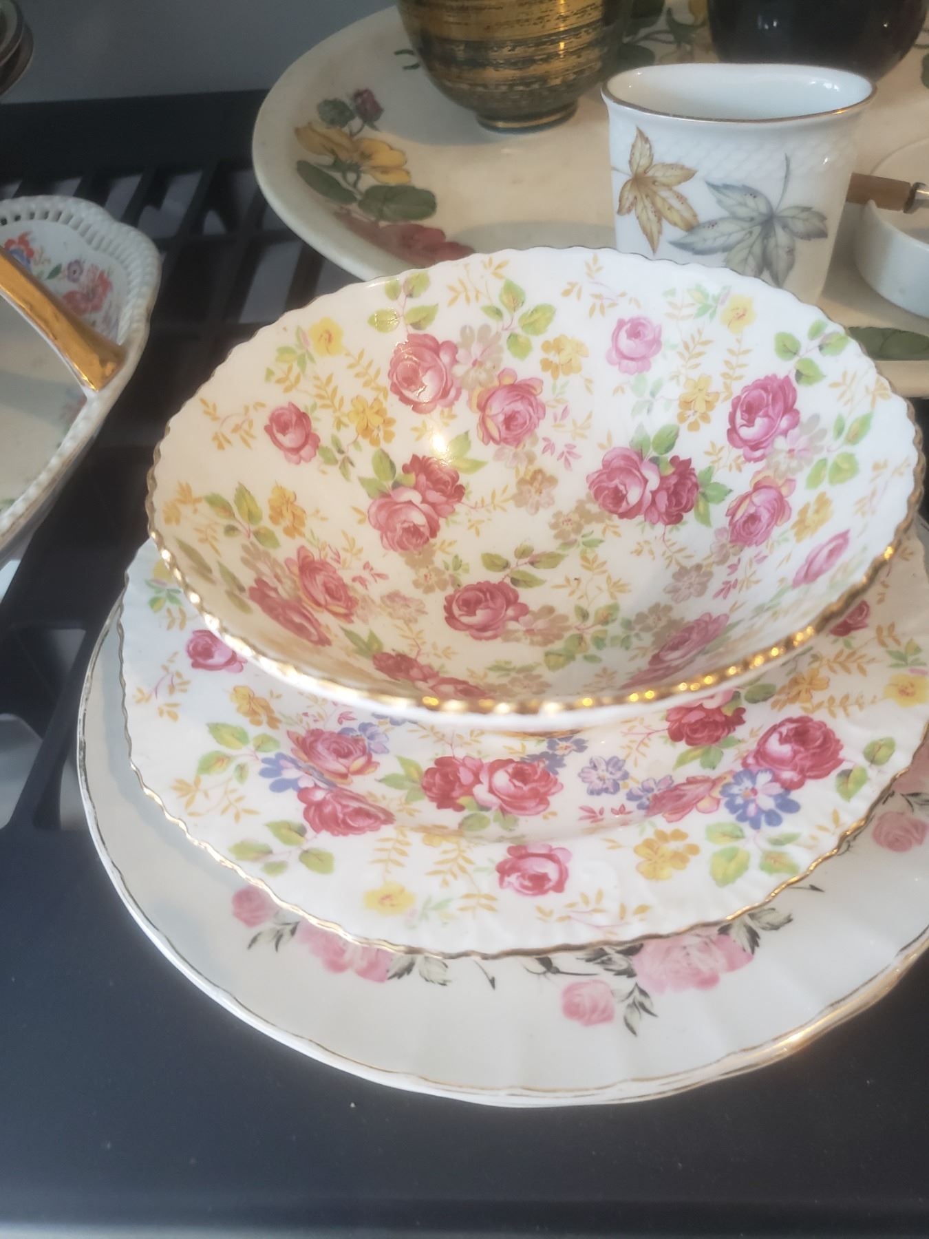 Large assortment 3 shelves of dinner plates, gravy boats, mugs, bread box, Royal Stafford china, canning jars & more. Please note some have chips. Bring packing materia and Pickup 9:00 am - 10:00 am