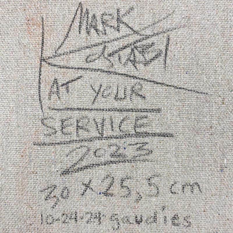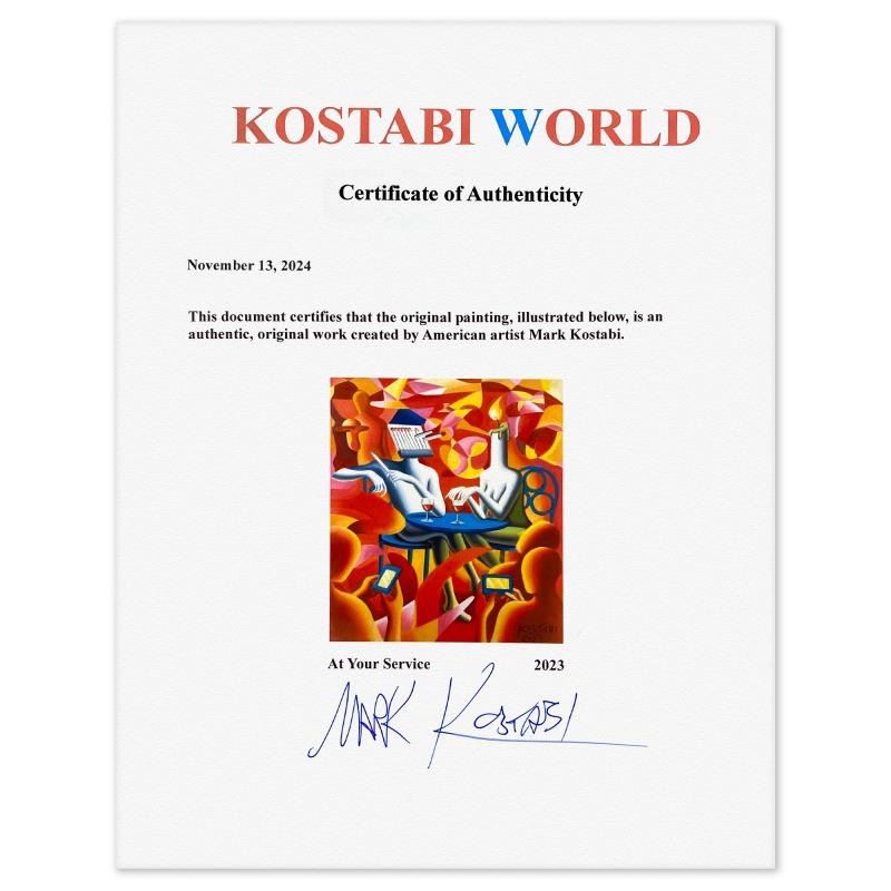 "At Your Service" is an original oil painting on canvas by Mark Kostabi, hand signed by the artist. This piece comes framed. Includes Certificate of Authenticity. Measures approx. 22" x 20" (frame), 12" x 10" (image). This item requires special handling and may have a longer than usual turnaround.