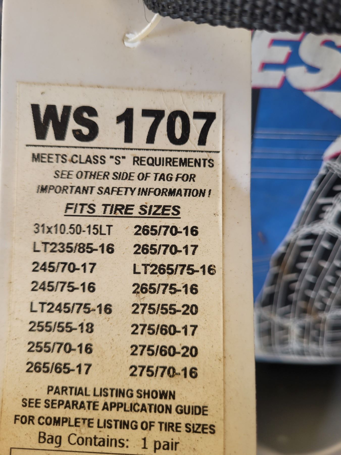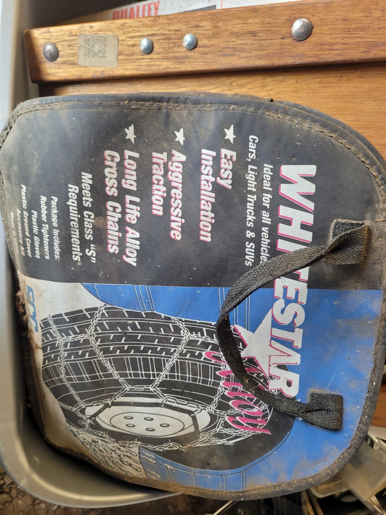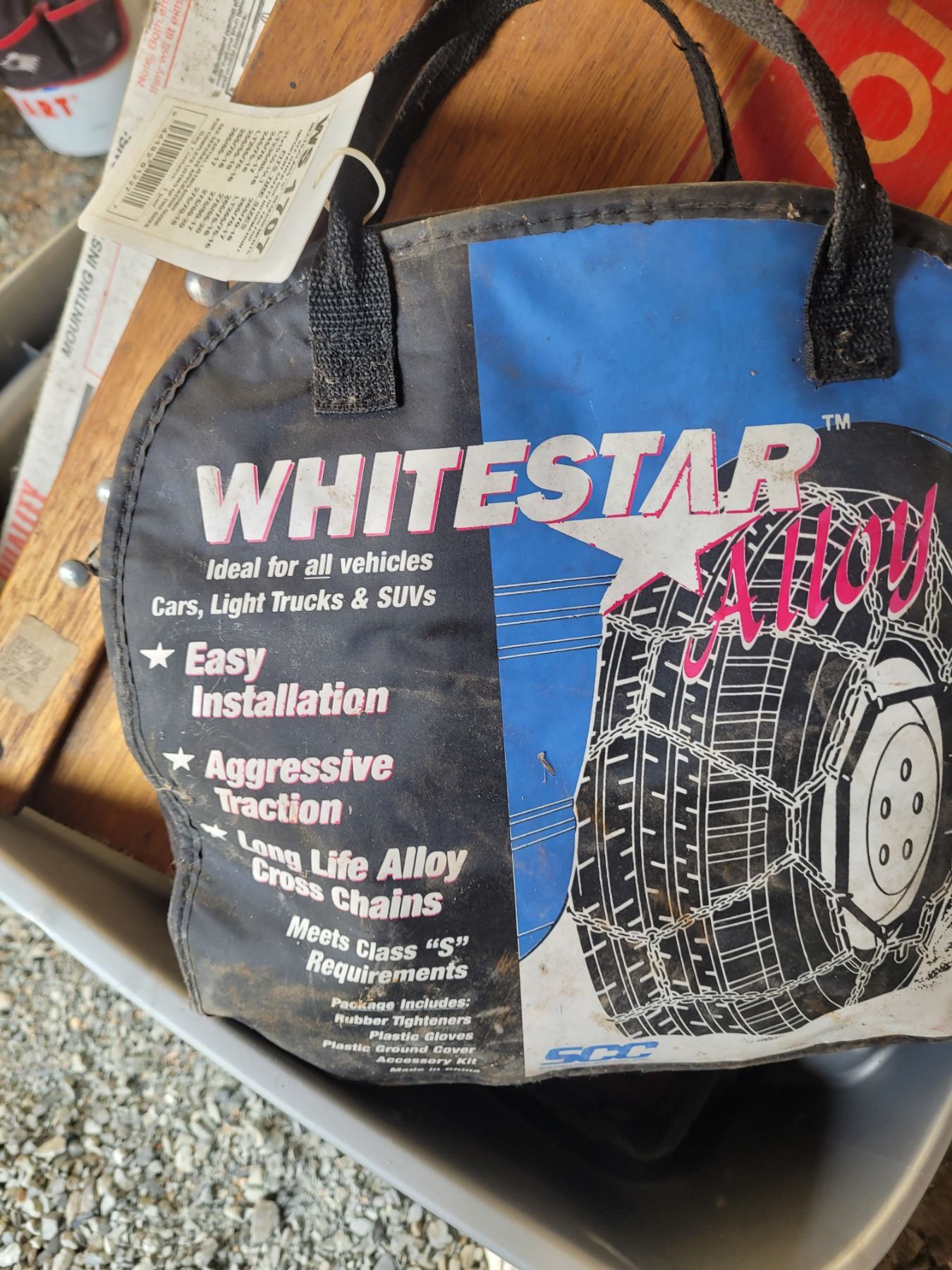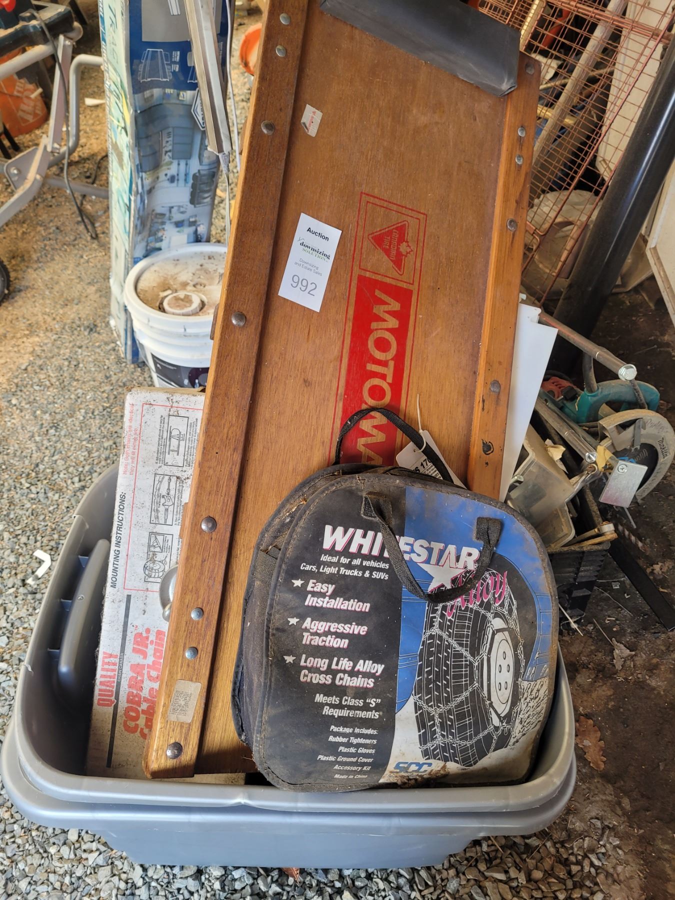 Motormaster Creeper, Whitestar tire chains, Cobra Cable Chain for light truck , truck mud guards and more. Pickup at 10 am