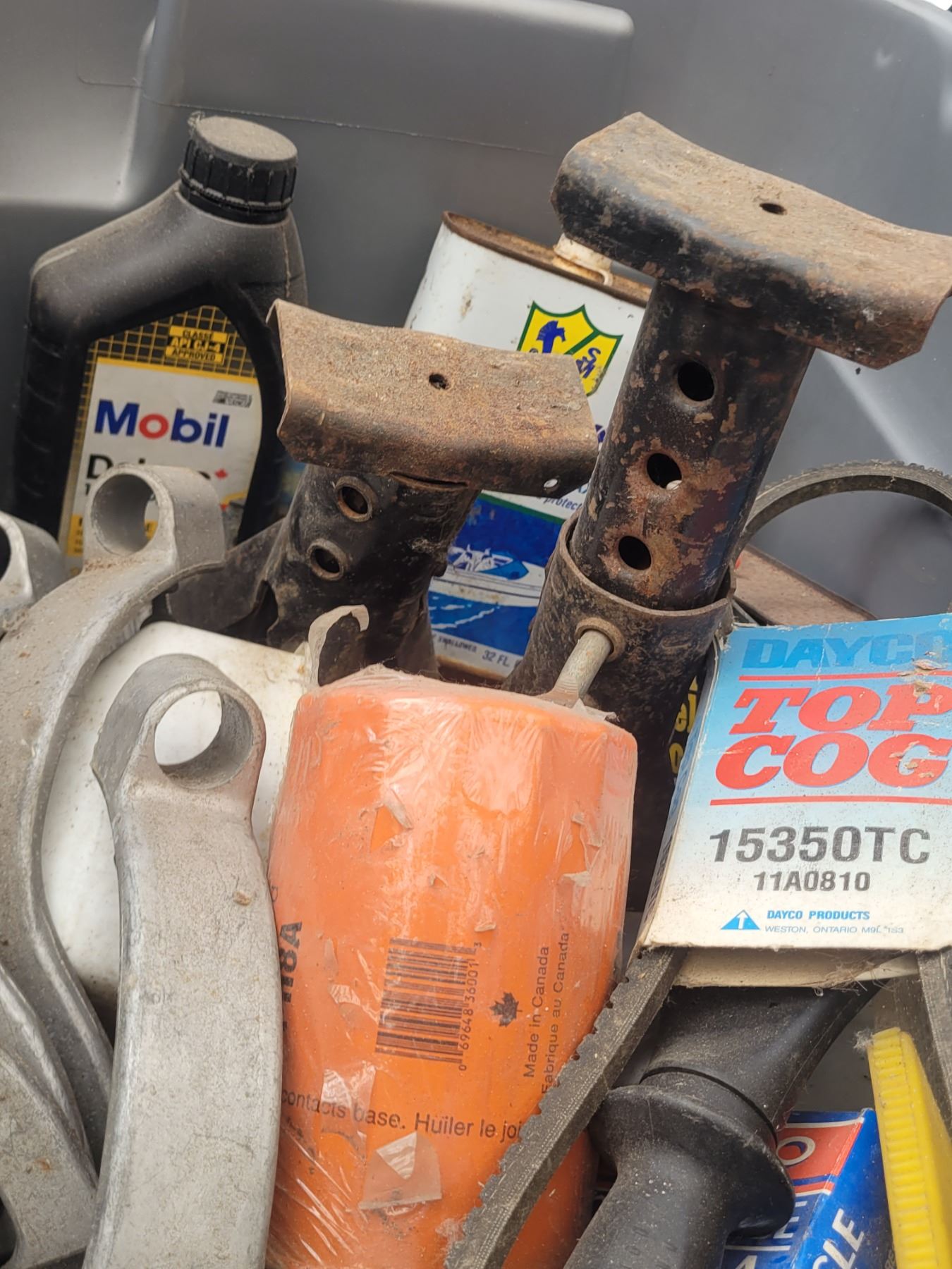 Car chains, Mobil Delvac, Fram air filter, jacks and more. Pickup at 11 am