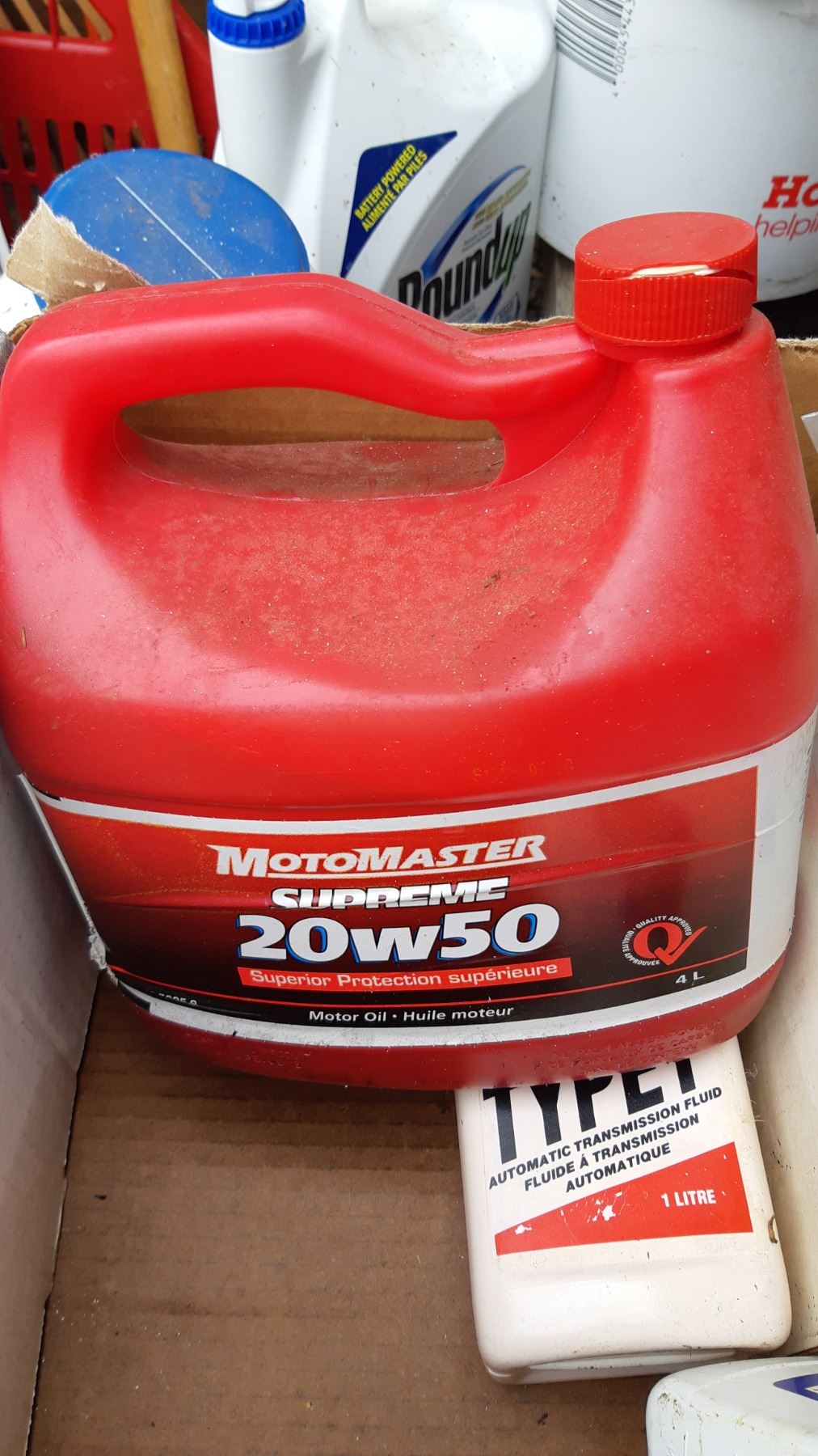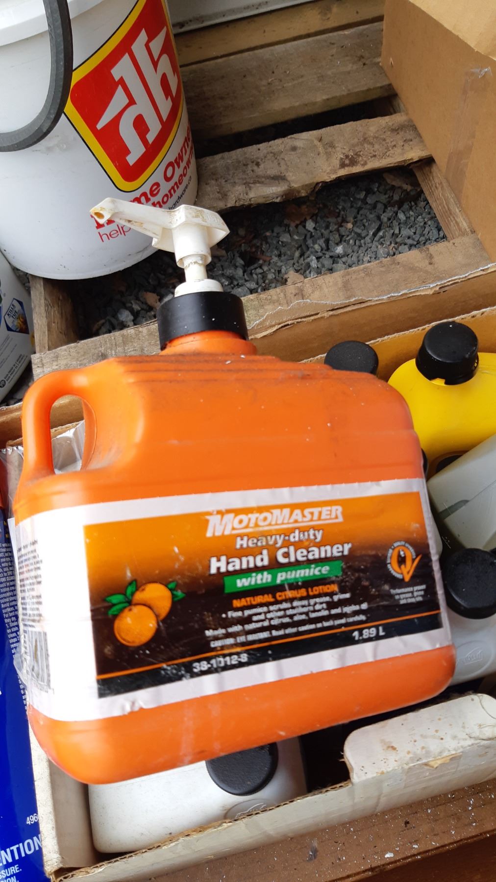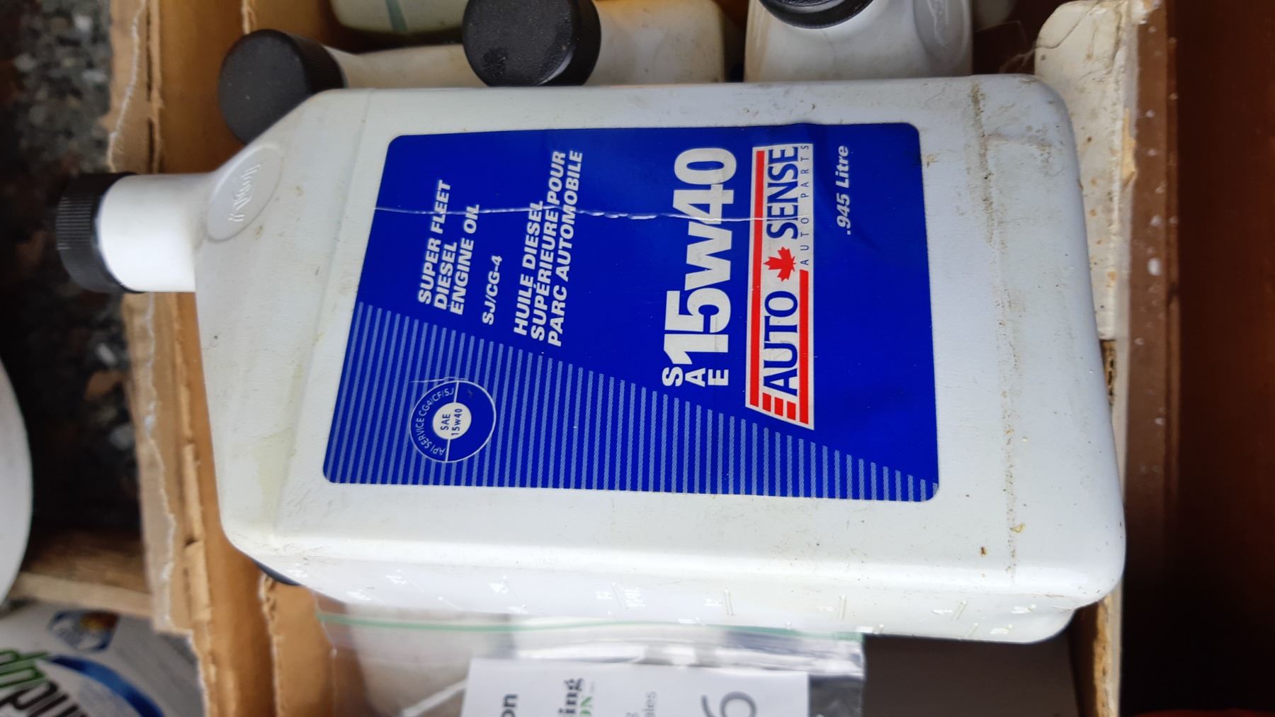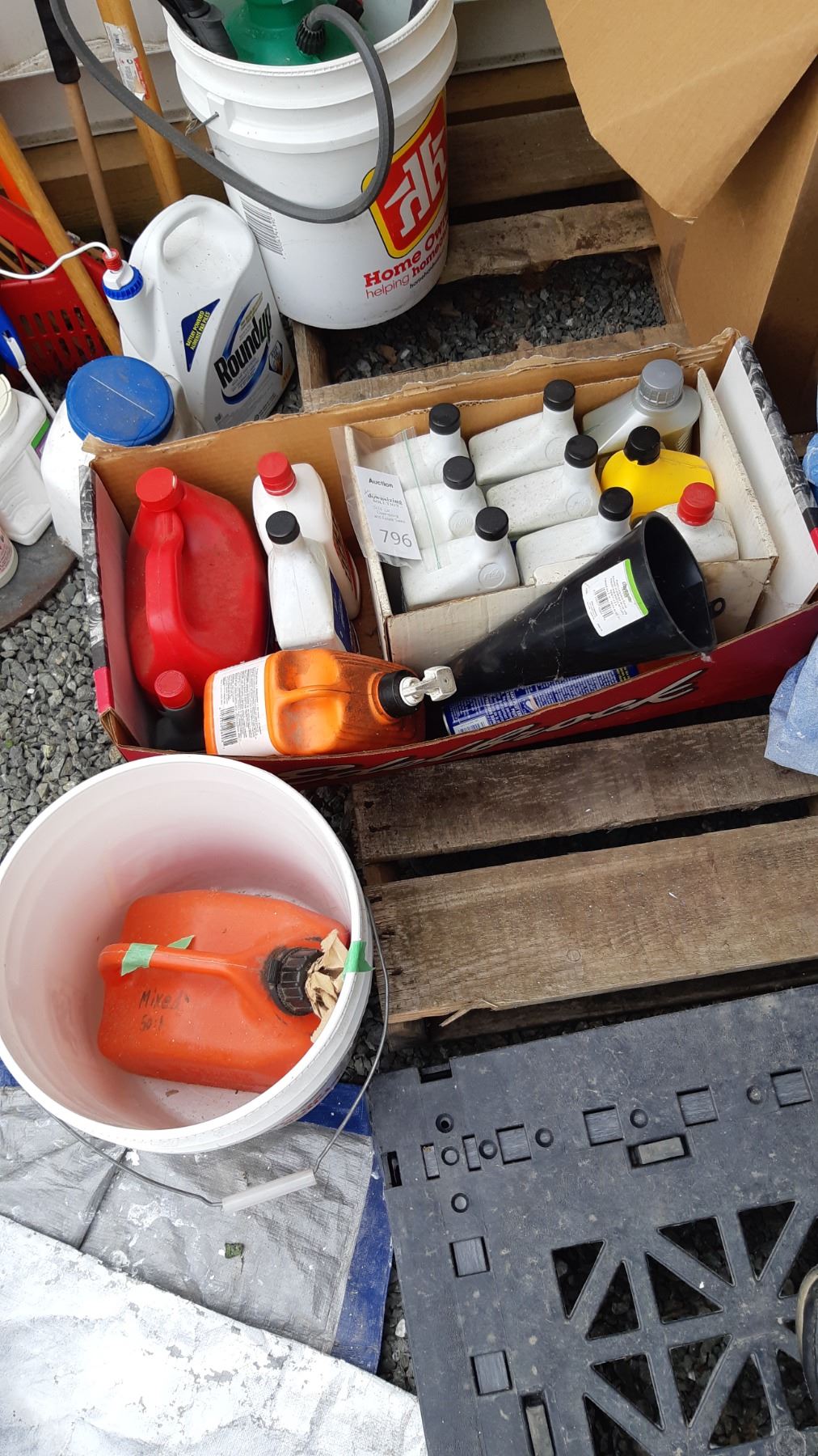 Box of car oil most are full, gas can, hand cleaner, cone for pouring oil. Pick up 9-10