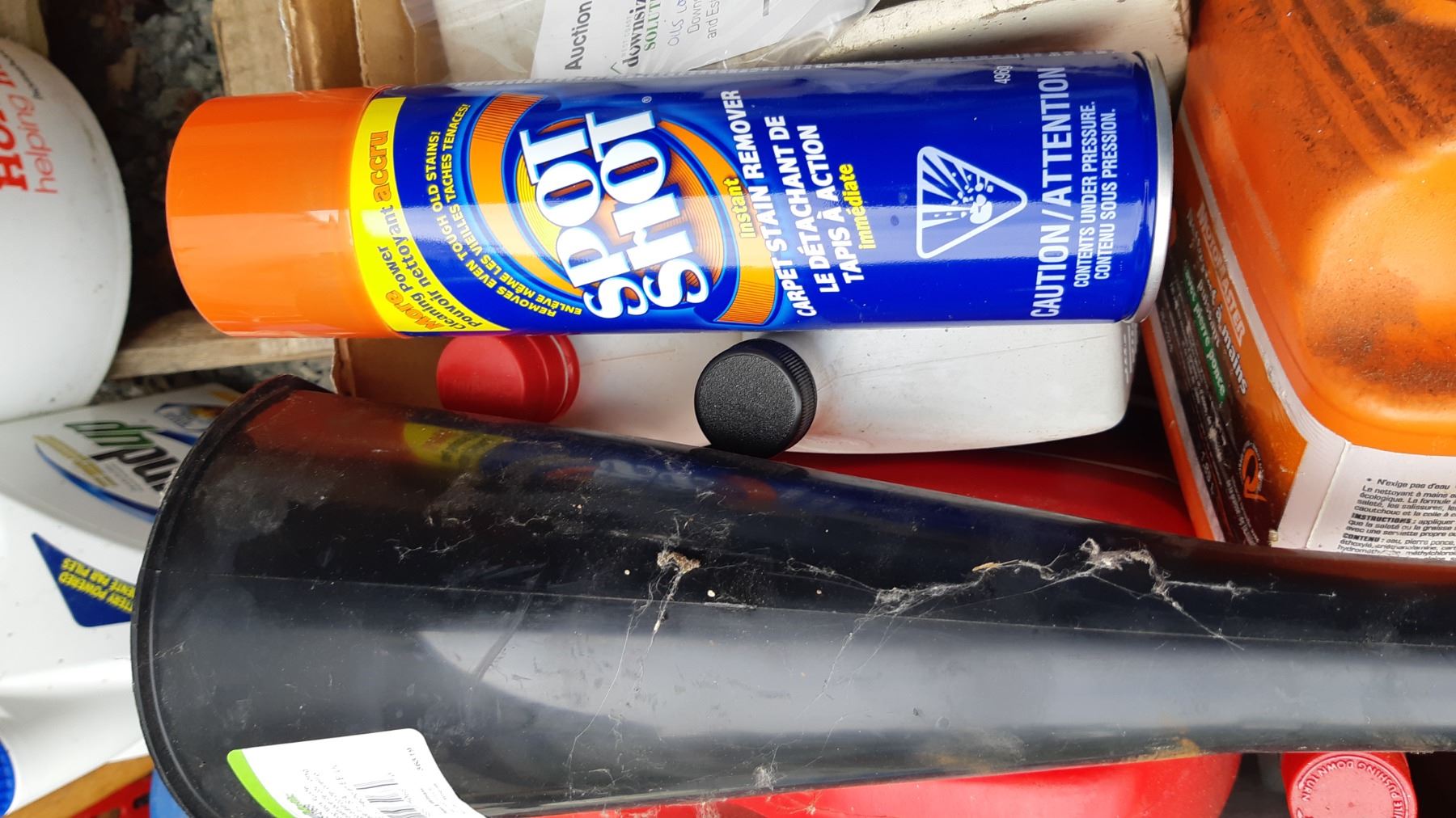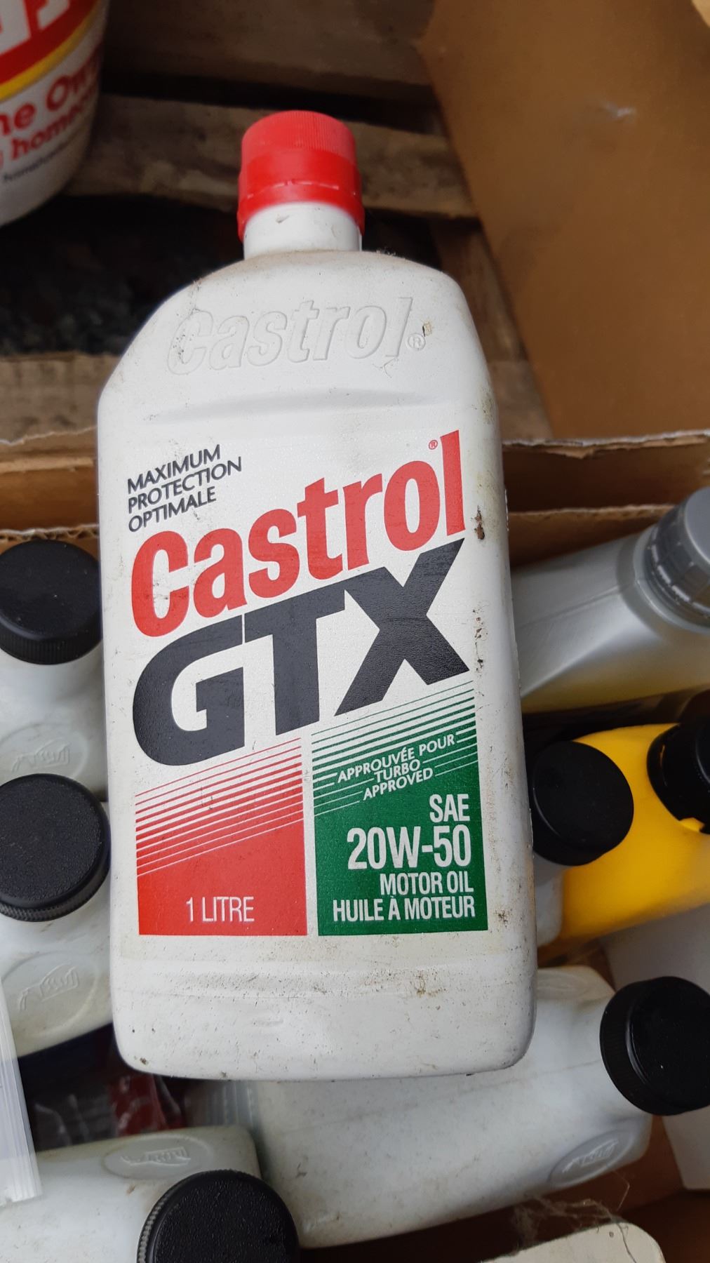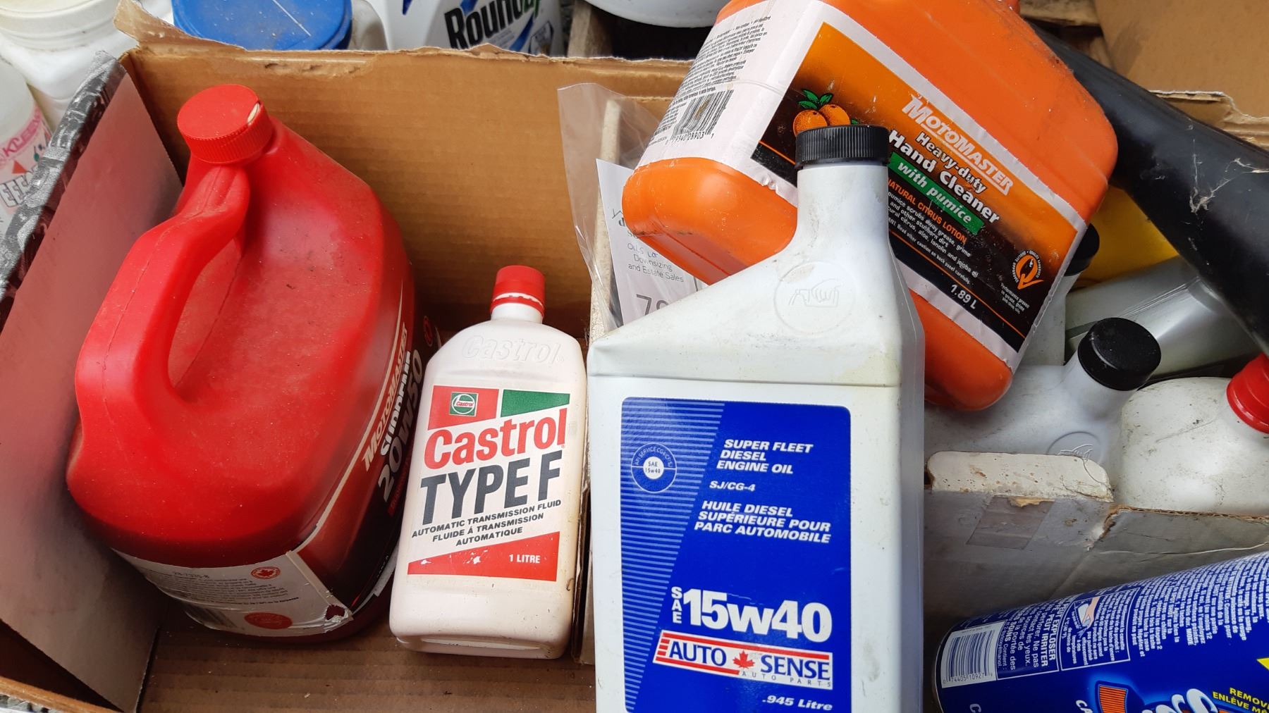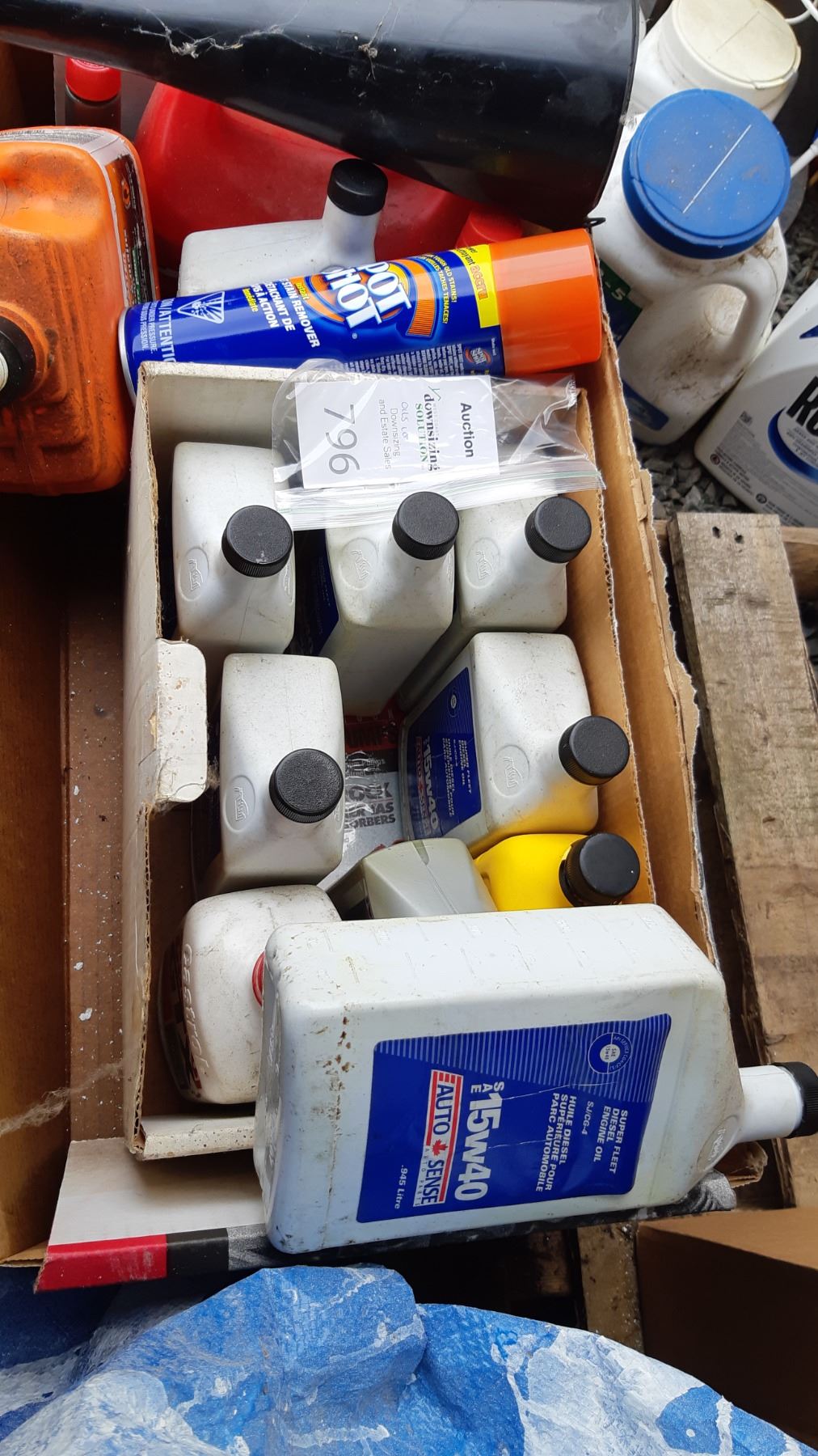 Box of car oil most are full, gas can, hand cleaner, cone for pouring oil. Pick up 9-10