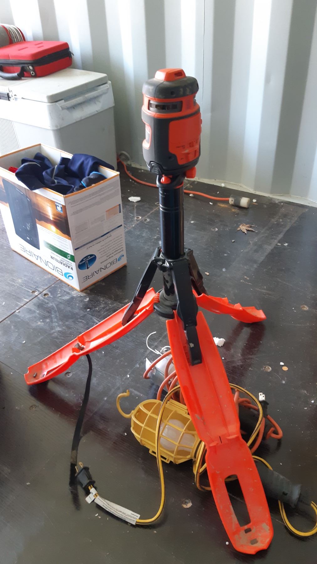 B&D 360 battery op auto laser lever, safety light, outdoor power cord. Bring packing and pickup at 10 am