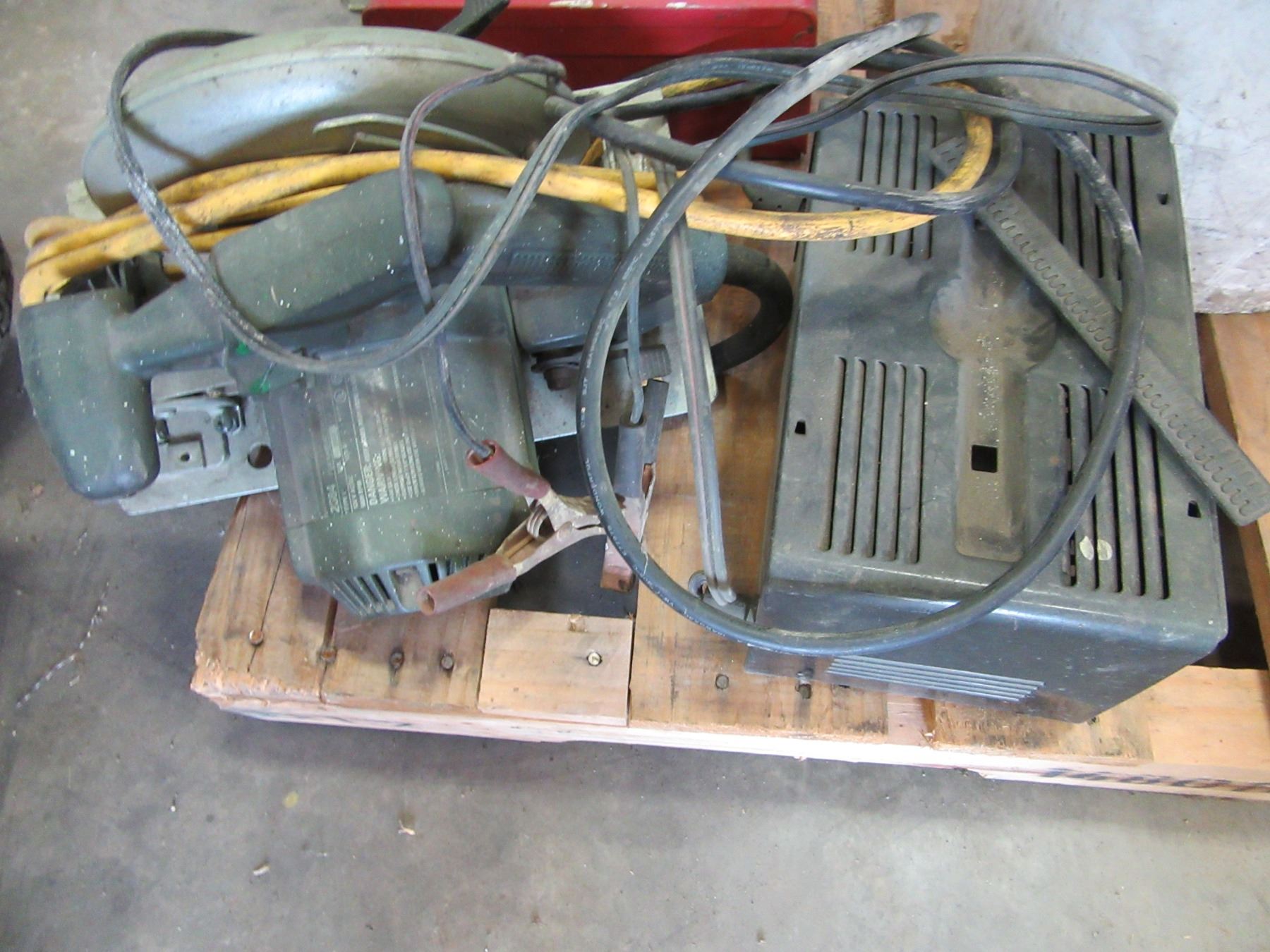 BATTERY CHARGER, CIRCULAR SAW & PAIL OF STRAPS/TIE DOWNS