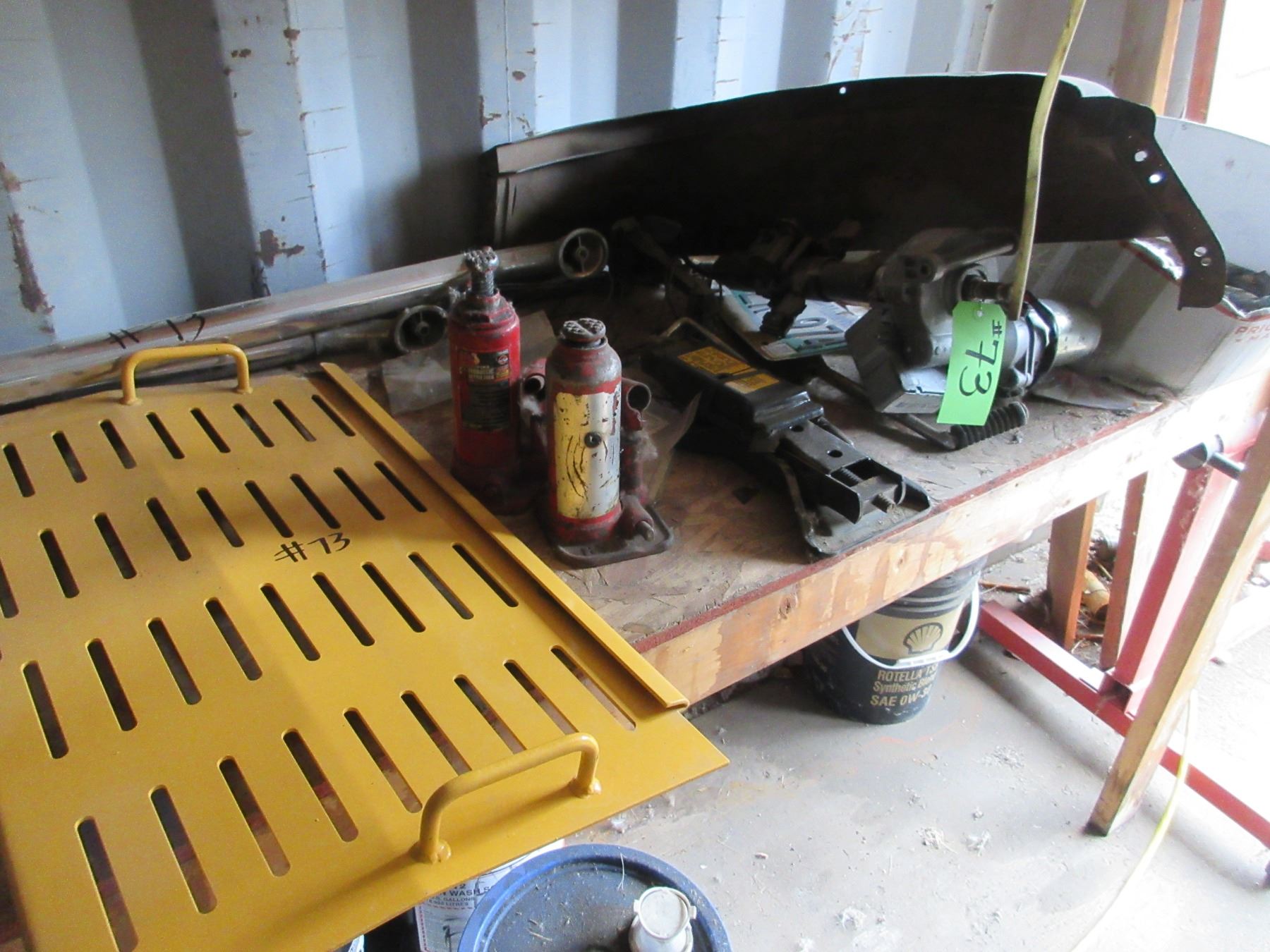 BELLOW SHROUD, 2 JACKS, CAR PARTS, TARP, WINDSHIELD JUGS, ETC
