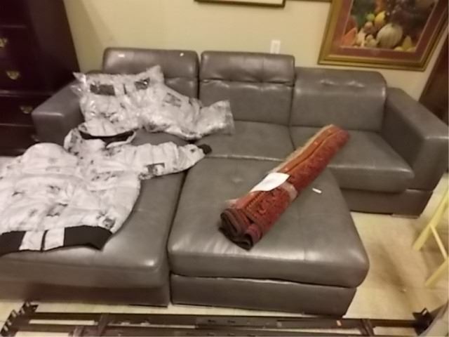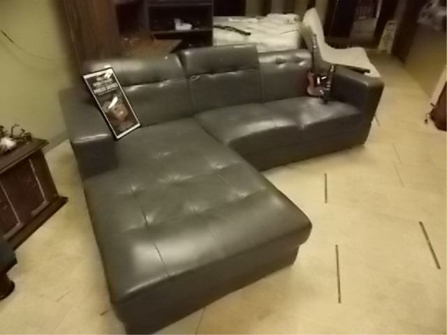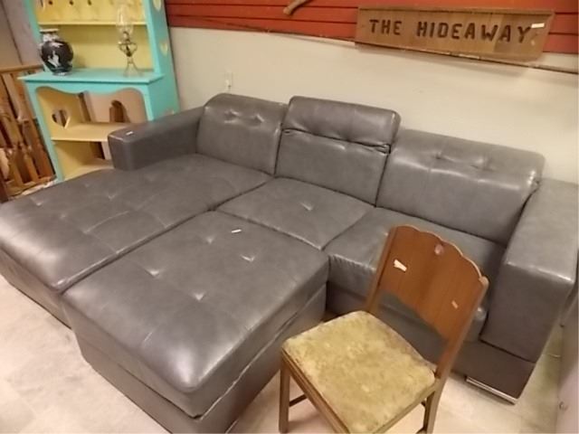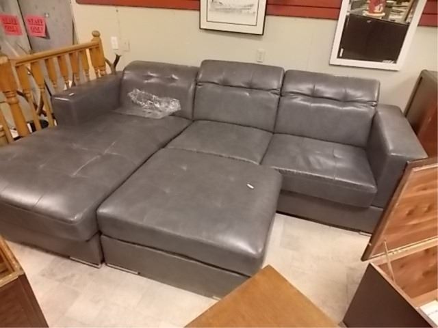 BONDED LEATHER SOFA - GREY - RECLINING HEAD RESTS WITH LARGE OTTOMAN - 3 PC TTL