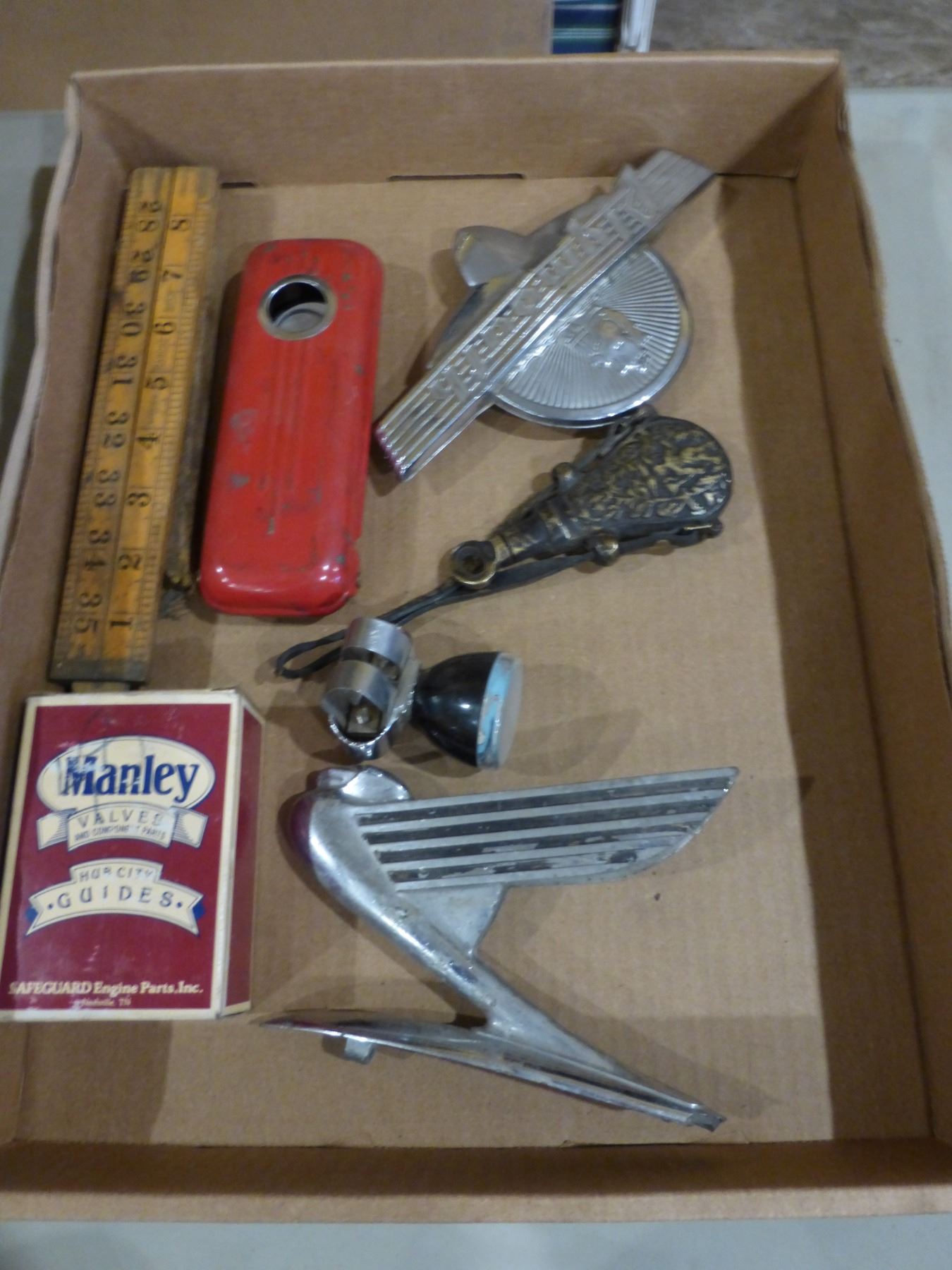 BOX C/W RULER, CAR EMBLEMS, ETC