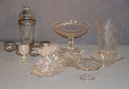 BOX LOT GLASS WITH ART DECO COCKTAIL SHAKER, DEPRESSION GLASS ETCHED VASE, ETC.