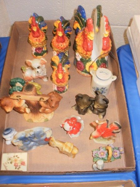 BOX LOT - KITCHEN ITEMS: SALT AND PEPPERS, NAPKIN HOLDERS, ETC.