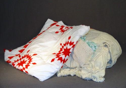 BOX LOT WITH CROCHETED BEDSPREAD, PATCHWORK QUILT
