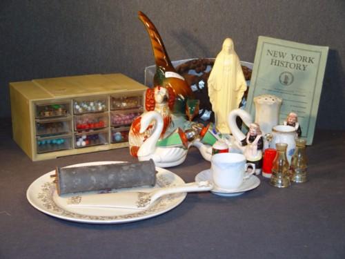 BOX LOT WITH STAFFORDSHIRE DOG, COSTUME JEWELRY, ETC.