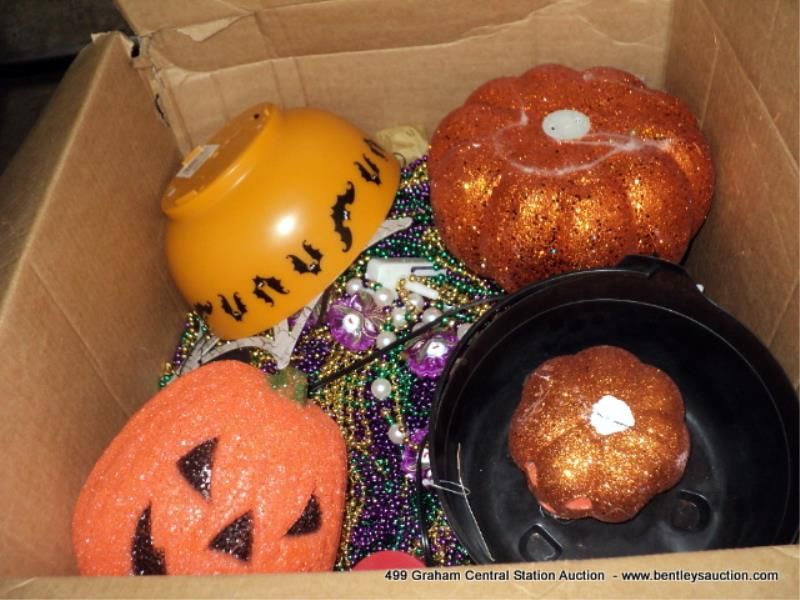 BOX: MARDI GRAS BEADS & ASSORTED HALLOWEEN DECORATIONS