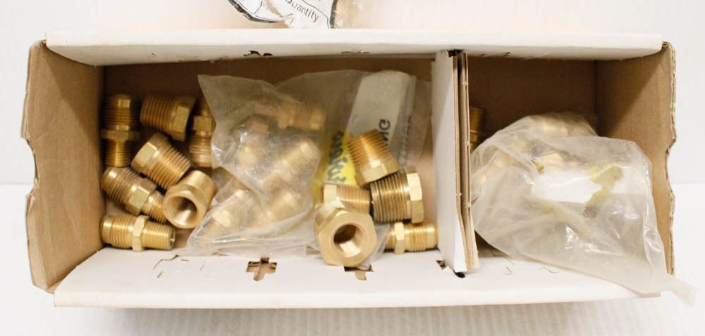 BOX OF ASSORTED BRASS HEX SCREW FITTINGS