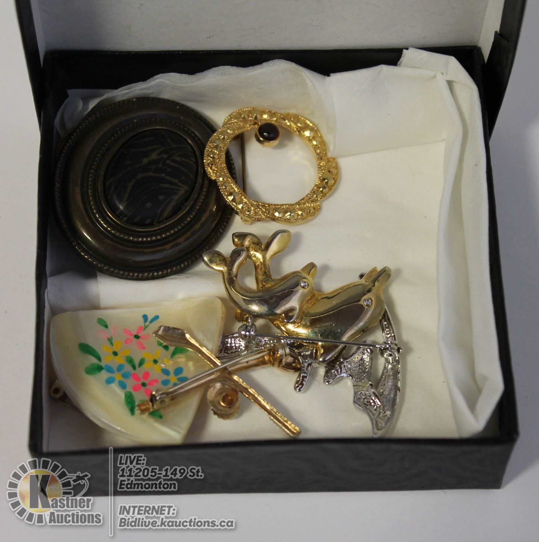 BOX OF ESTATE BROOCHES DOLPHINE AND MORE DOLPHINS, CURLING BROOCH AND MORE