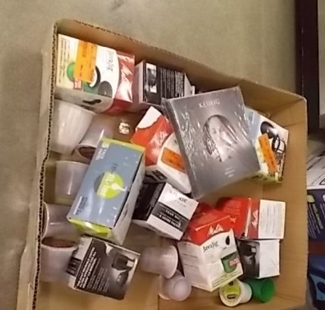 BOX OF NEW COFFEE FILTERS AND MORE - STR ( open box - may or may not work - sold as-is - no warranty or guarantee implied ) - PACKAGES DAMAGED MOSTLY