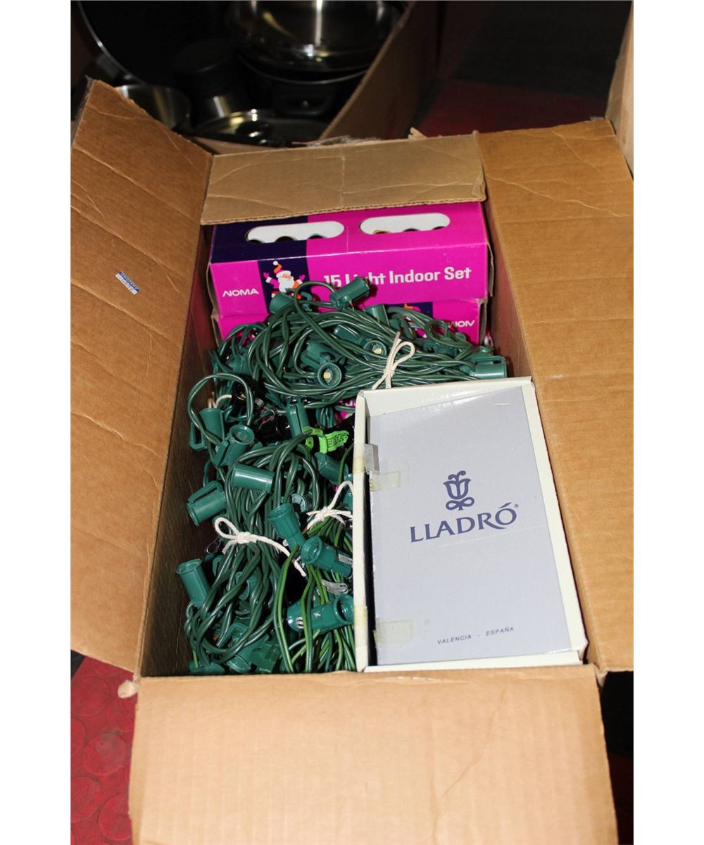 BOX W/ XMAS LIGHTS AND TREE STAND