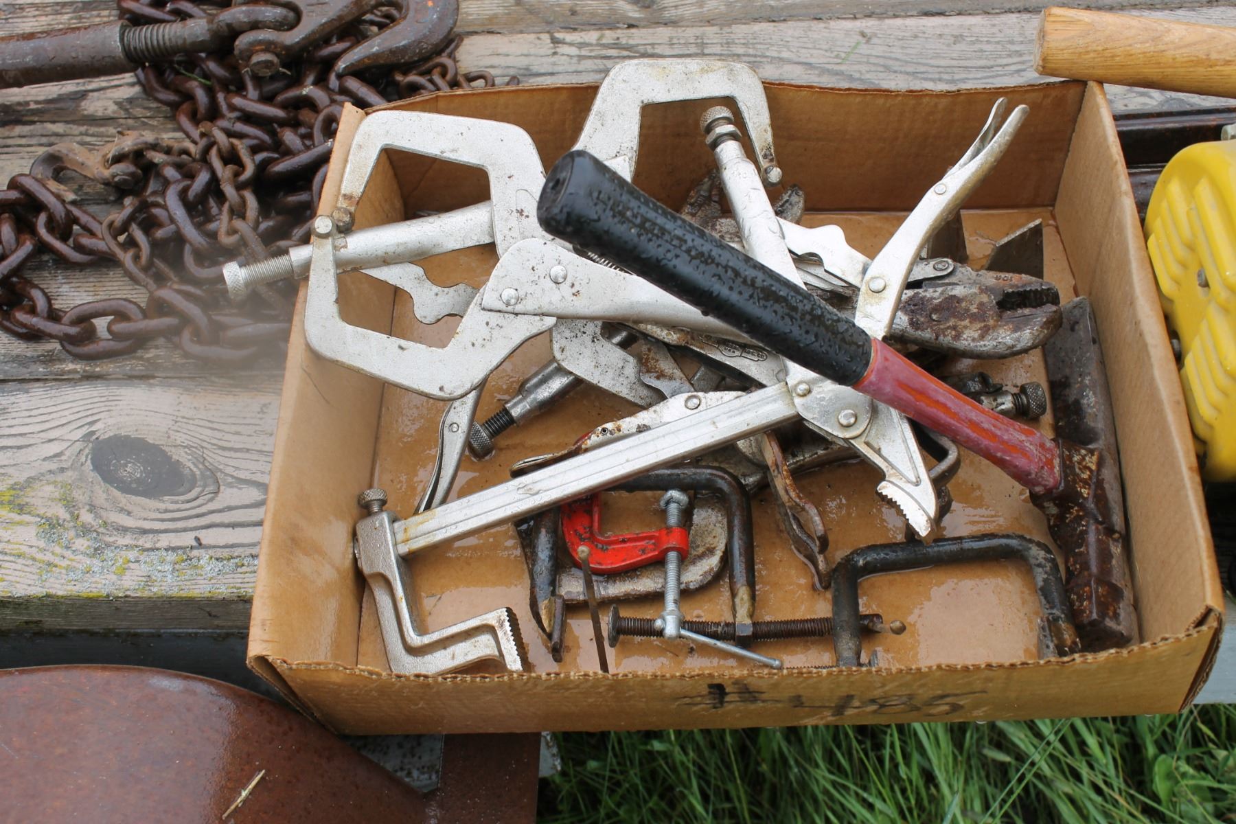 BOX WITH ASSORTED CLAMPS, HAMMER, ETC
