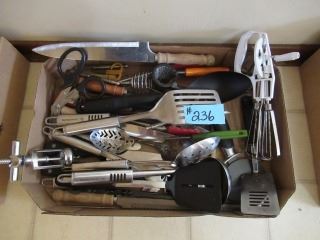 BOX WITH ASSORTED KITCHEN UTENSILS INCLUDING KNIVES, HAND BEATERS