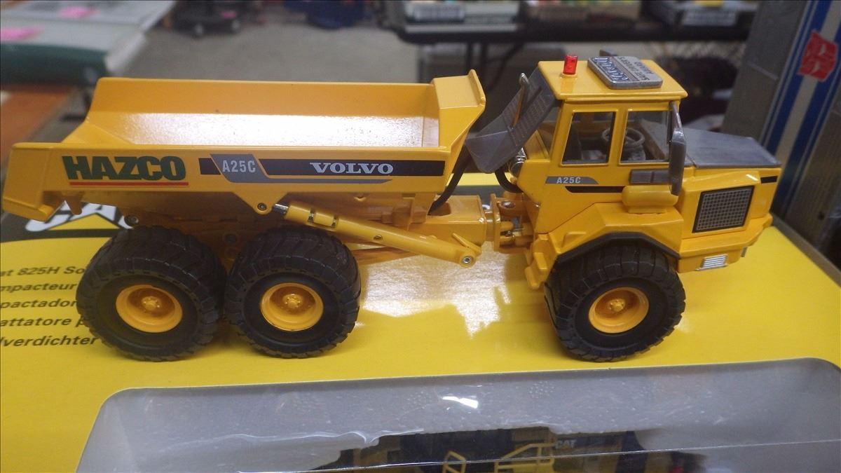 BOX WITH CAT COLLECTIBLE DIE CAST 825 H SOIL COMPACTOR IN BOX, VOLVO A25C DUMP TRUCK, 1955 FORD TOOTH PICK HAULER, SEMI TRUCK AND TRAILER, RAM EMBLEM