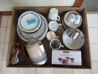BOX WITH CORELLE DISHWARE, COFFEE POT, CORNINGWARE SALT & PEPPER SHAKERS, ETC