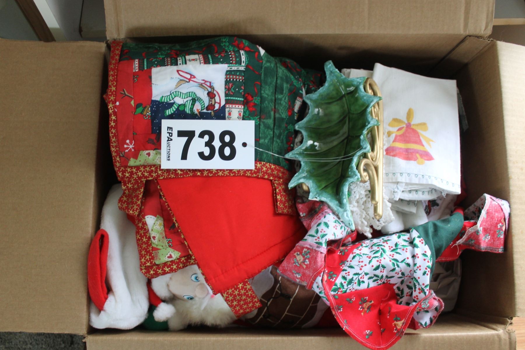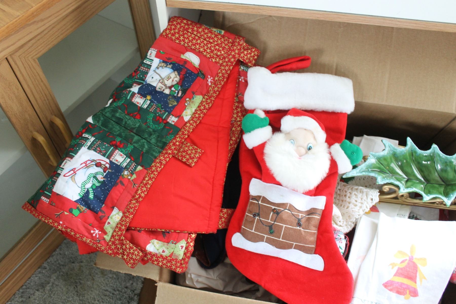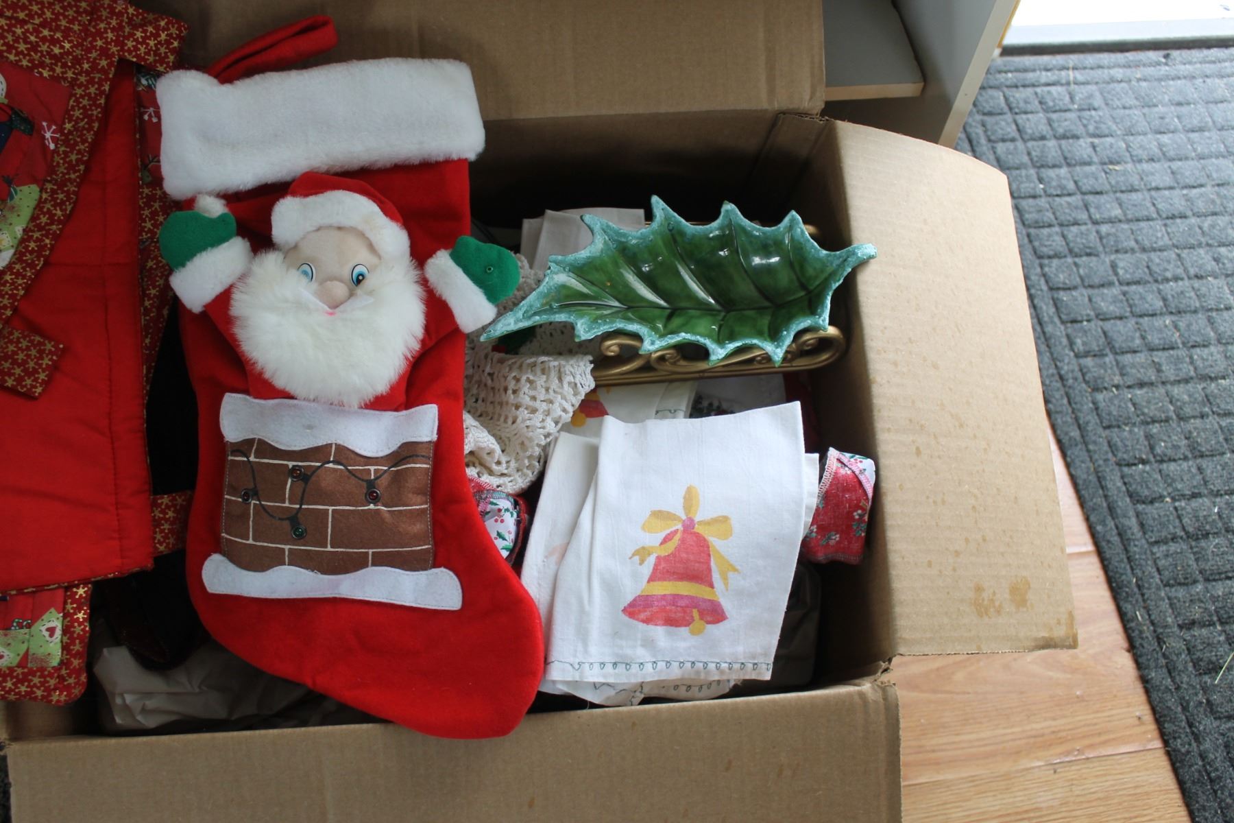 BOX WITH LINEN, CASSEROLES, CHRISTMAS DECORATIONS, ETC