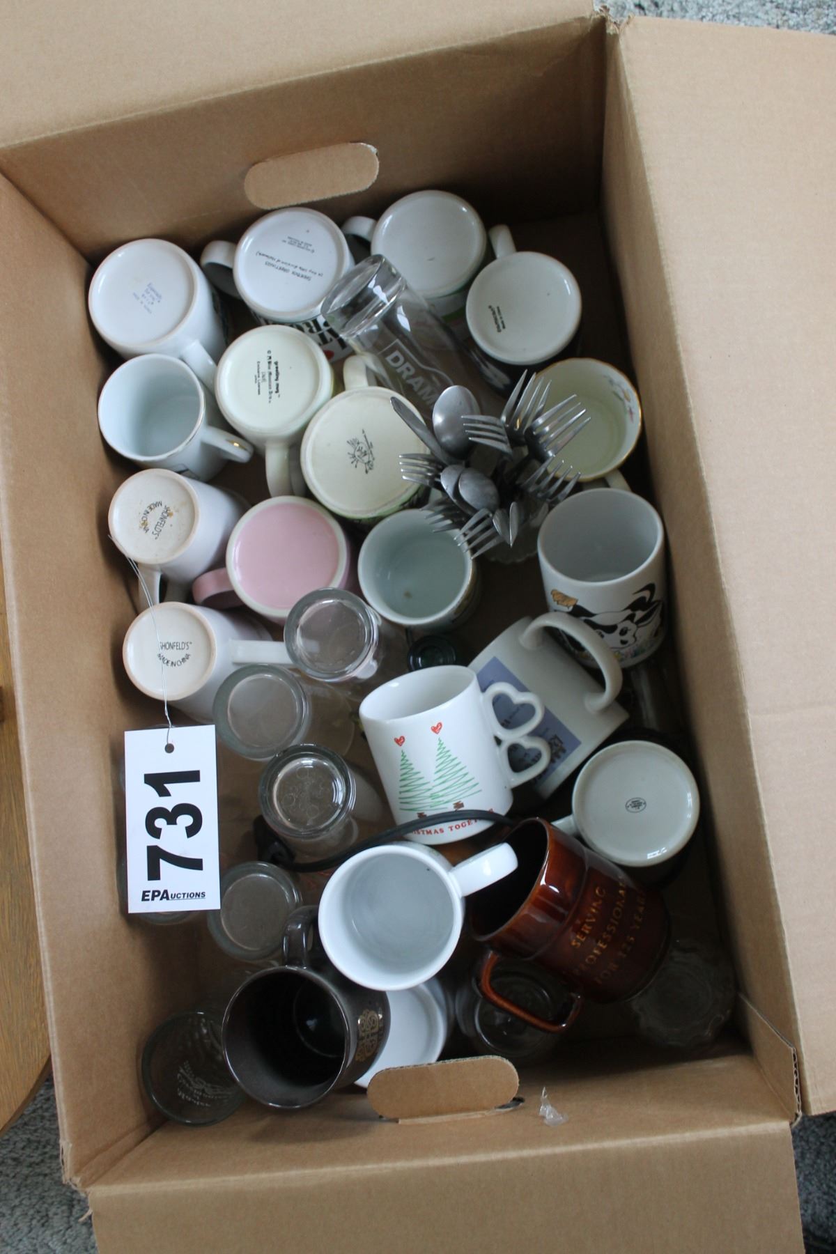 BOX WITH MUGS, GLASSES, UTENSILS, ETC