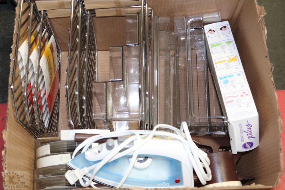 BOX WITH OFFICE ORGANIZERS, CLOTHES IRON ETC