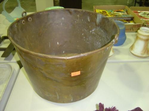 BRASS BUCKET; NO HANDLE; HAS BEEN REPAIRED