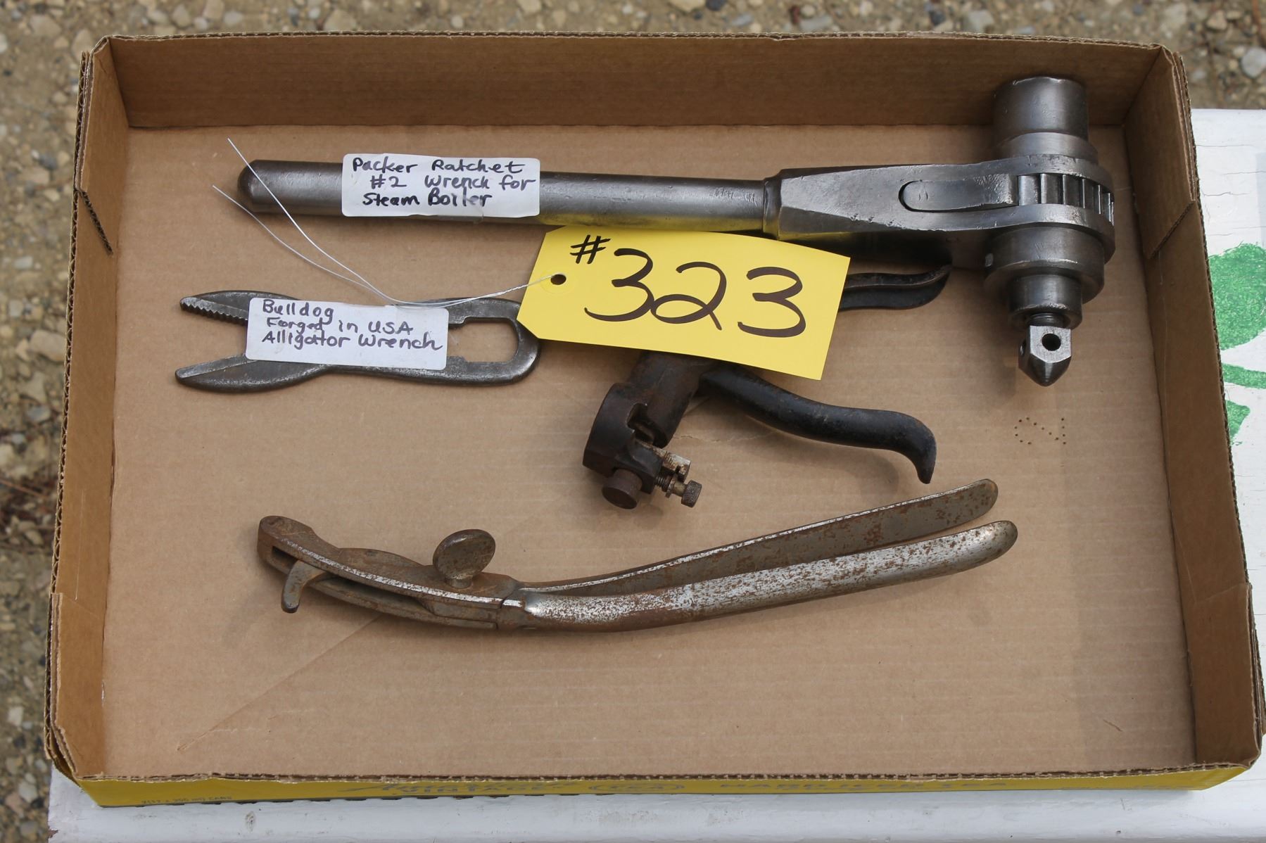 BULL DOG ALLIGATOR WRENCH, PACKER RATCHET, WRENCH FOR STEAM BOILER, RIVETER, MISC. TOOL
