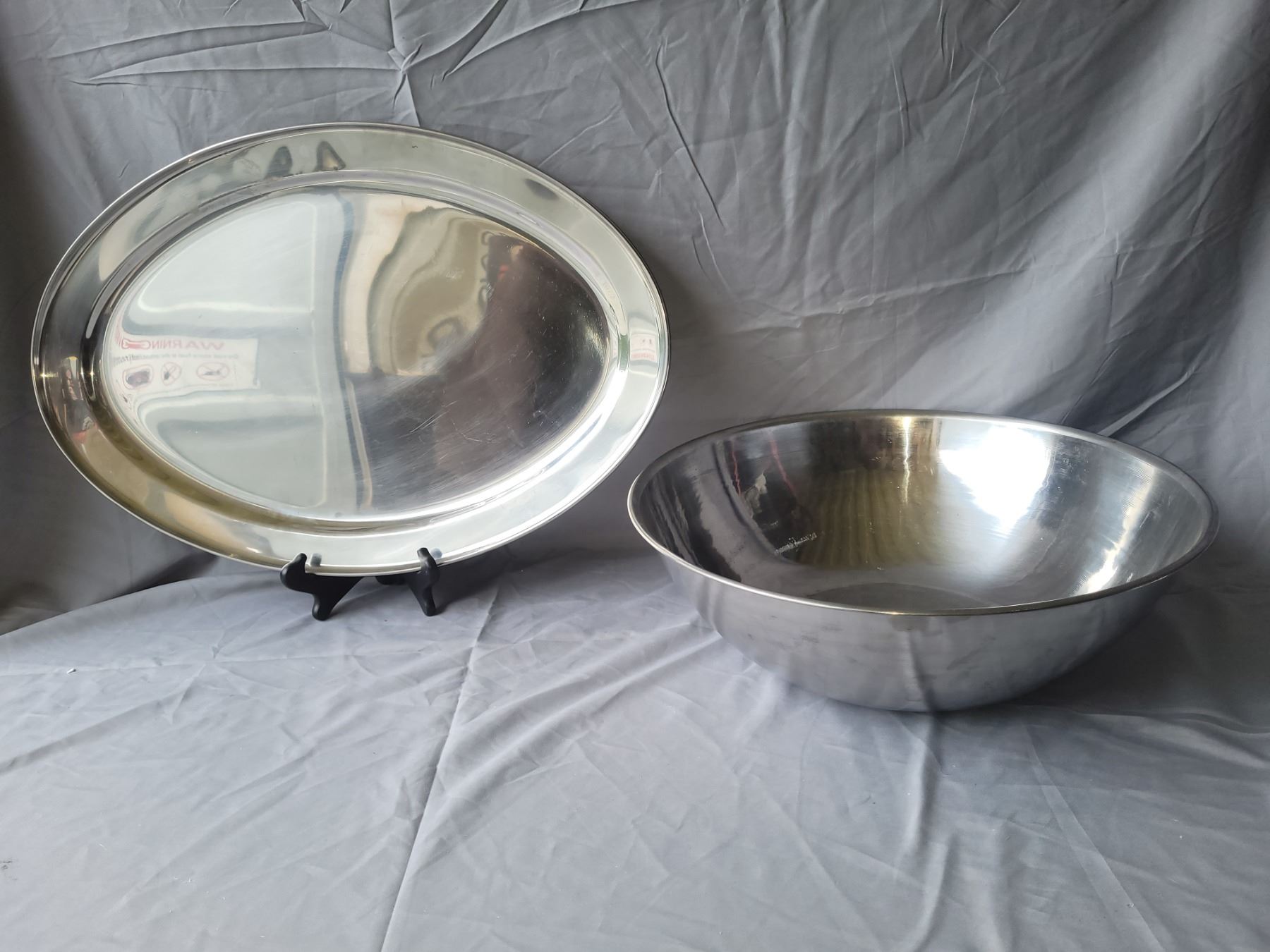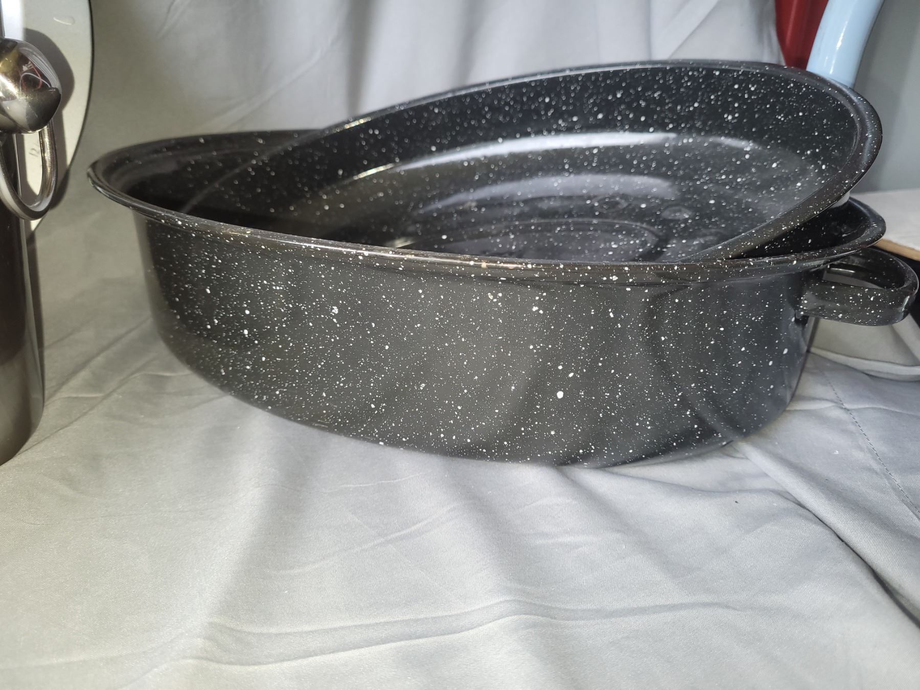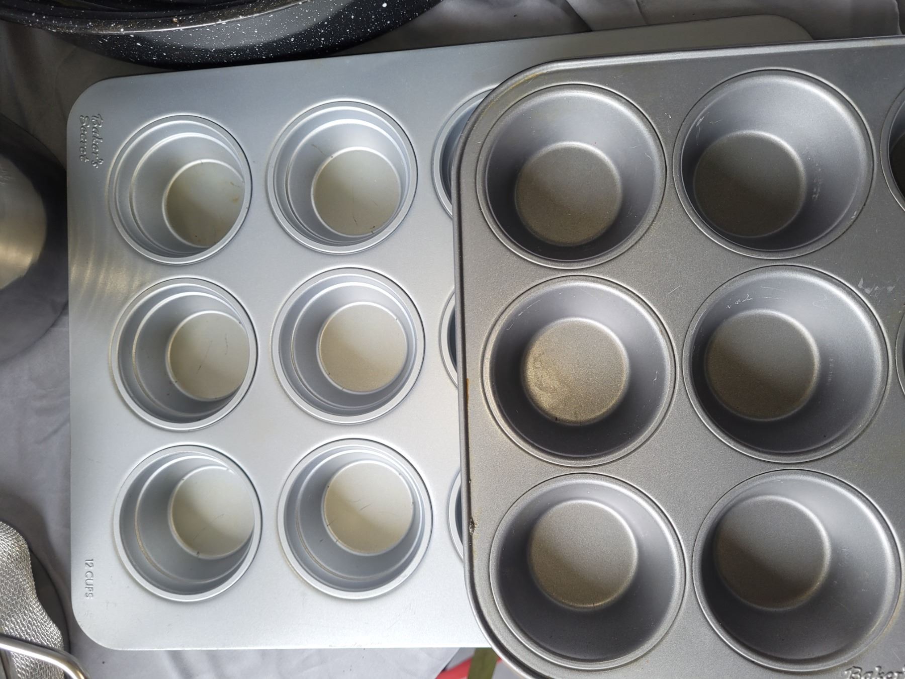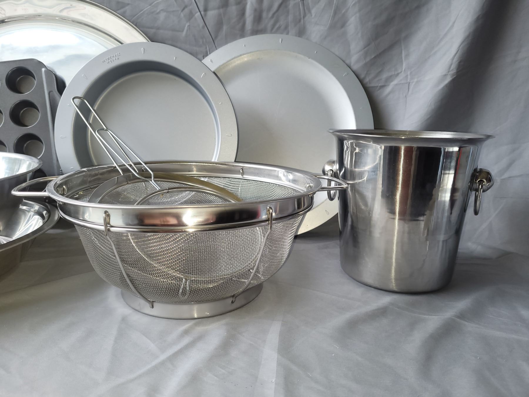 Bakers secrete, muffin tins, granite lidded roaster, 21" oval metal platter, large steel bowl, wine bucket and more. Pickup at 10 am