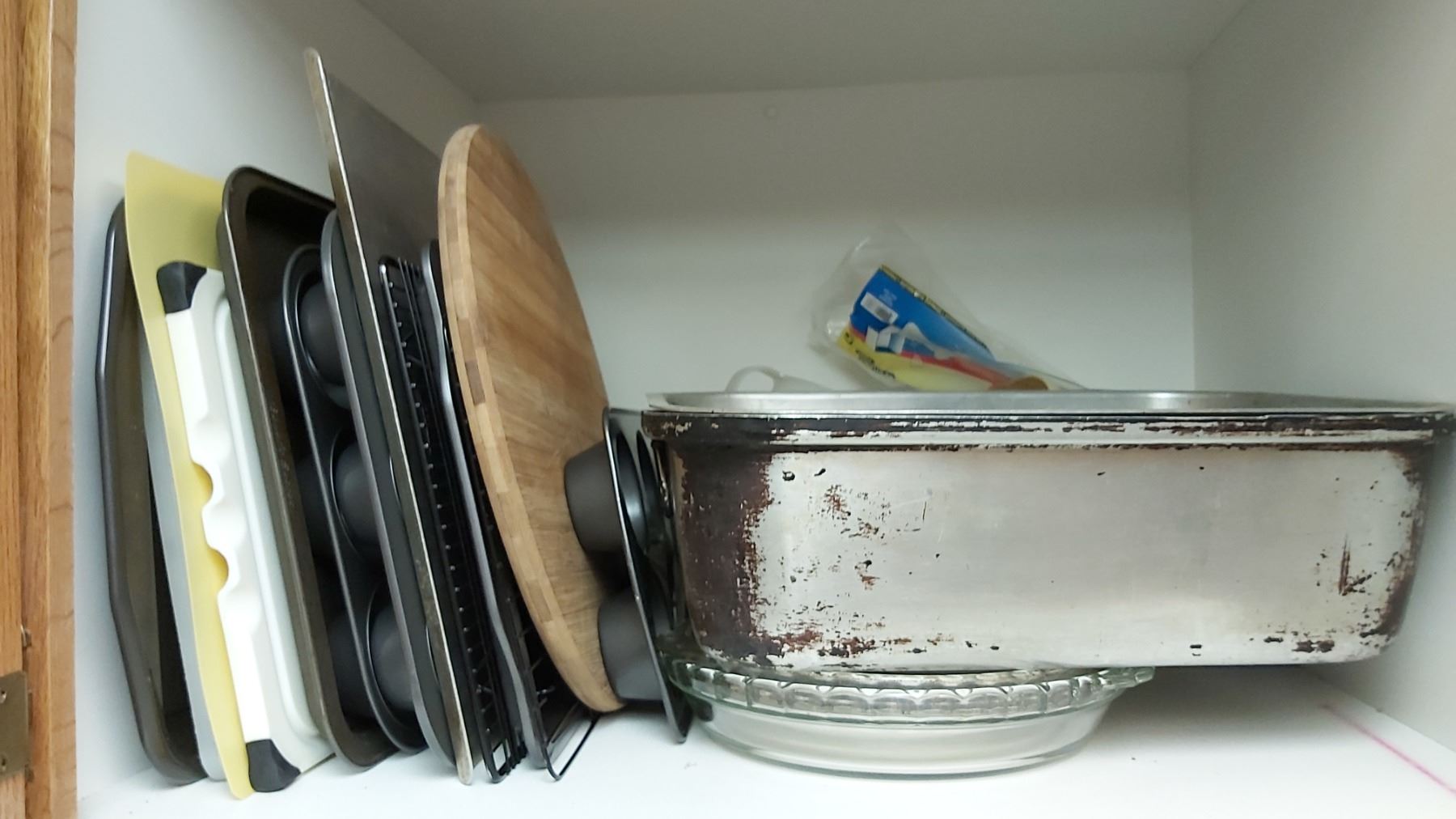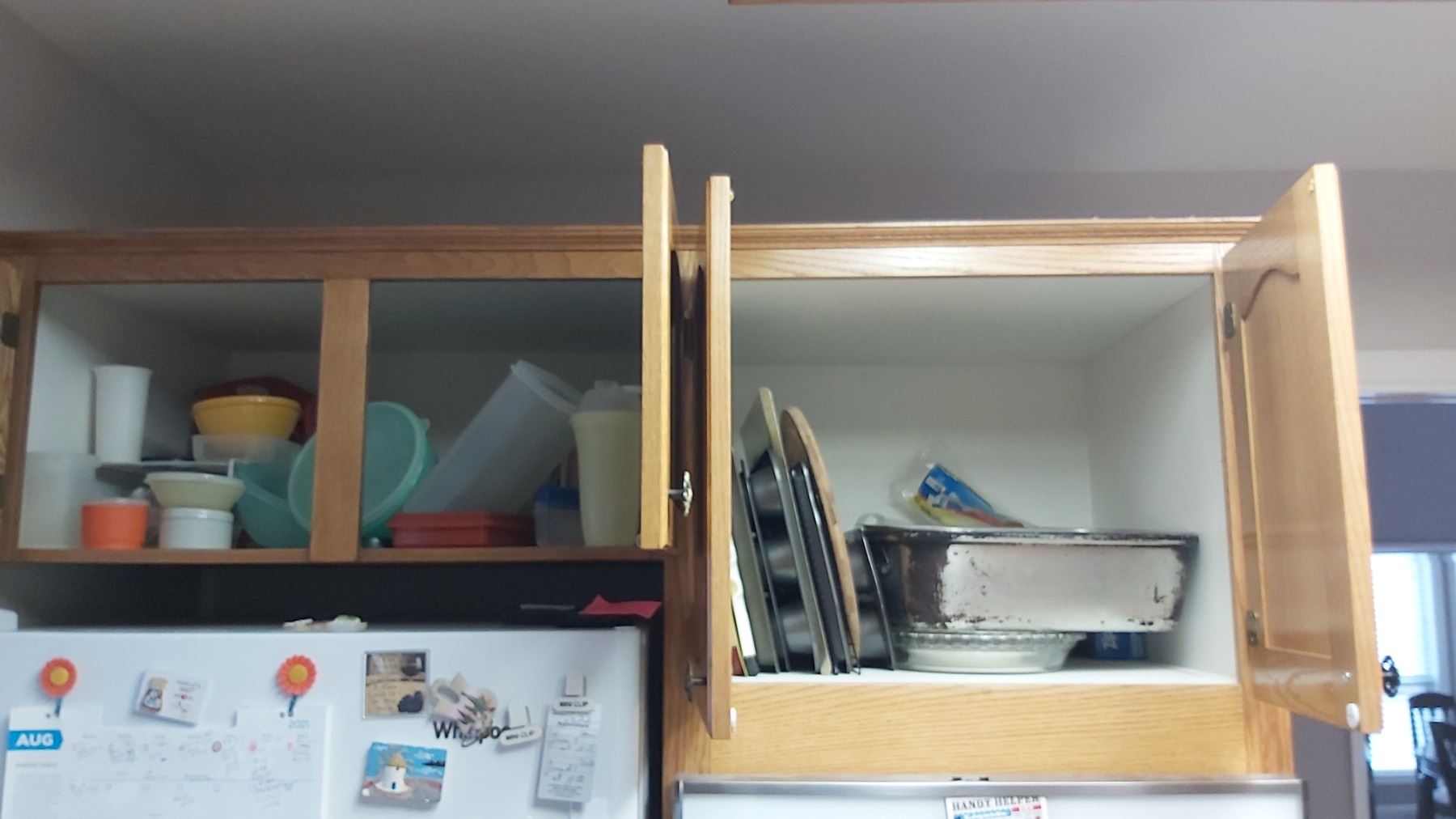 2 Cupboards of baking trays oven roaster food storage containers and more.Bring packing materials and pickup at 9 am