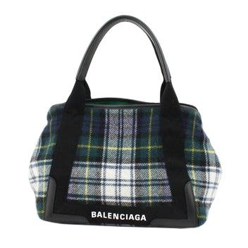 Balenciaga Green Multicolor Wool Checks Small Navy Cabas Bag