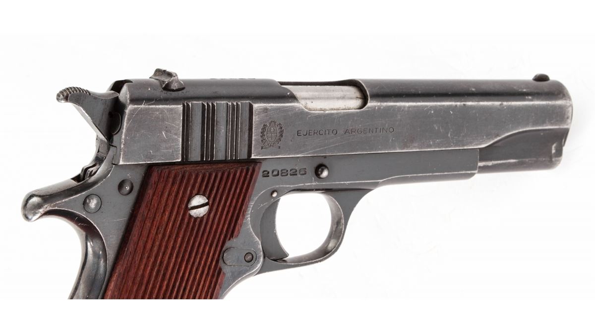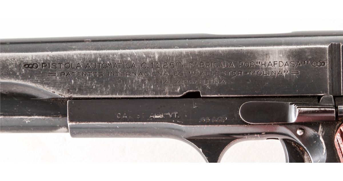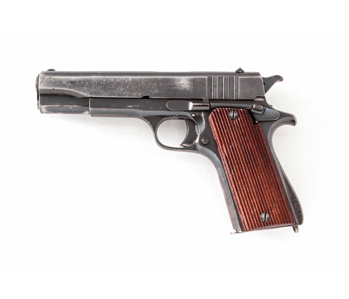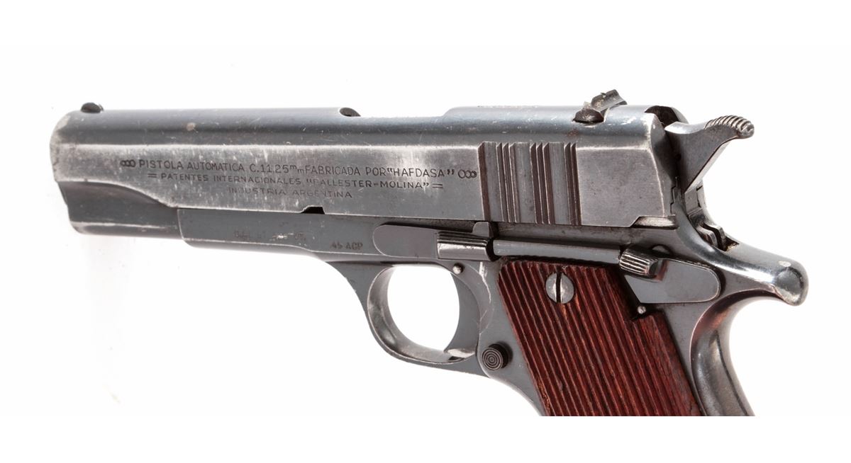 Ballester-Molina Semi-Automatic Pistol, #20826, 11.25mm (.45 ACP cal.), 5'' barrel, blue finish, serrated hardwood grips. Right side of slide marked ''Ejercito Argentino''. Condition is very good to near fine retaining approx. 85% blue. Frame, slide and barrel with matching numbers; lower portion of frame at mainspring swell numbered #41065. Magazine is mismatched. Grips are mostly crisp with very light pressure dings to lower portion of left panel. Crisp action, fine bore. Lightly import marked. Est.: $350-$500. (C&R/PPT)